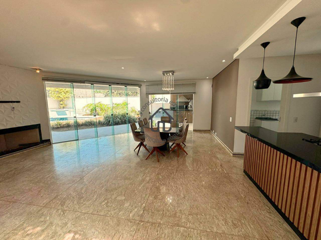 A cozinha em conceito aberto, integrada à sala de jantar, proporciona praticidade e amplitude no dia a dia. Para os momentos de lazer, a área gourmet é completa, com forno de pizza, fogão a lenha, churrasqueira e forno convencional, tudo isso totalmente integrado à área da piscina com hidromassagem, ducha e banheiro externo.