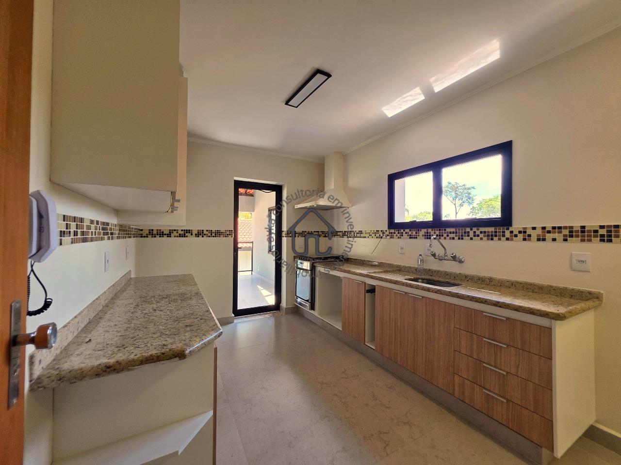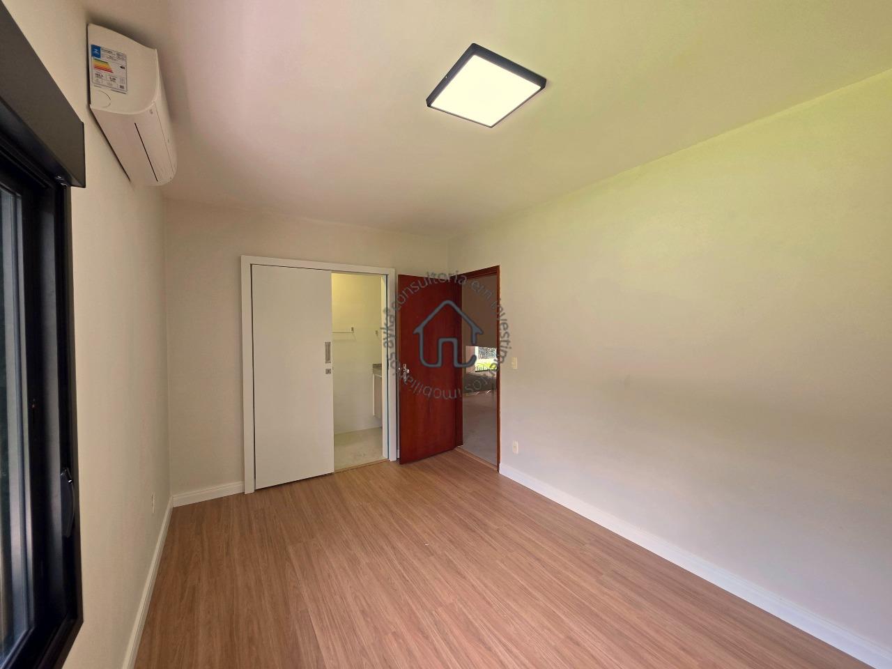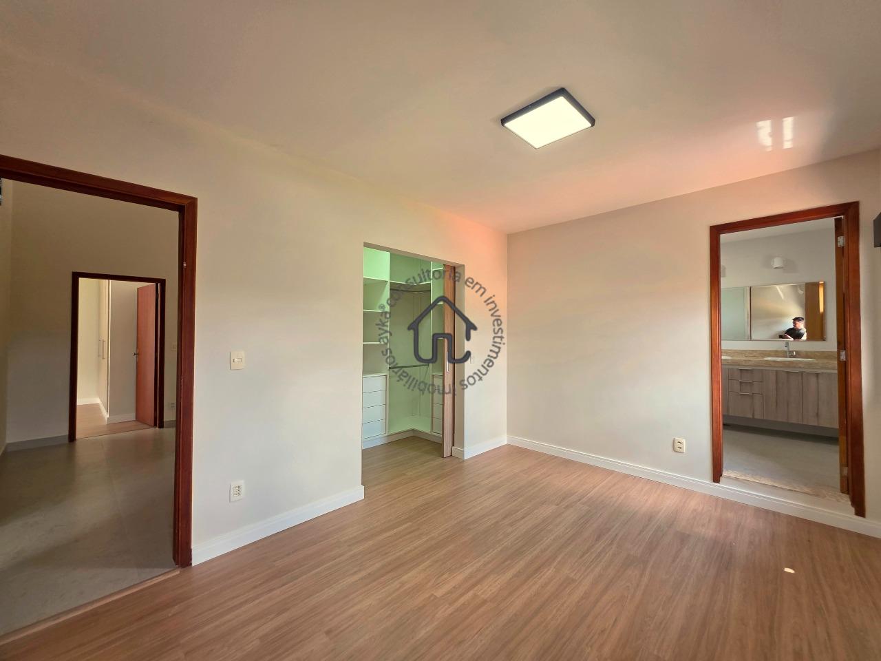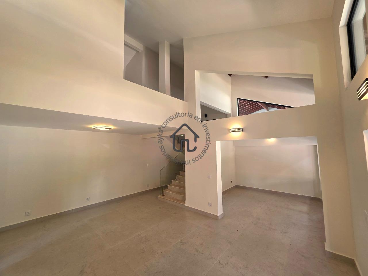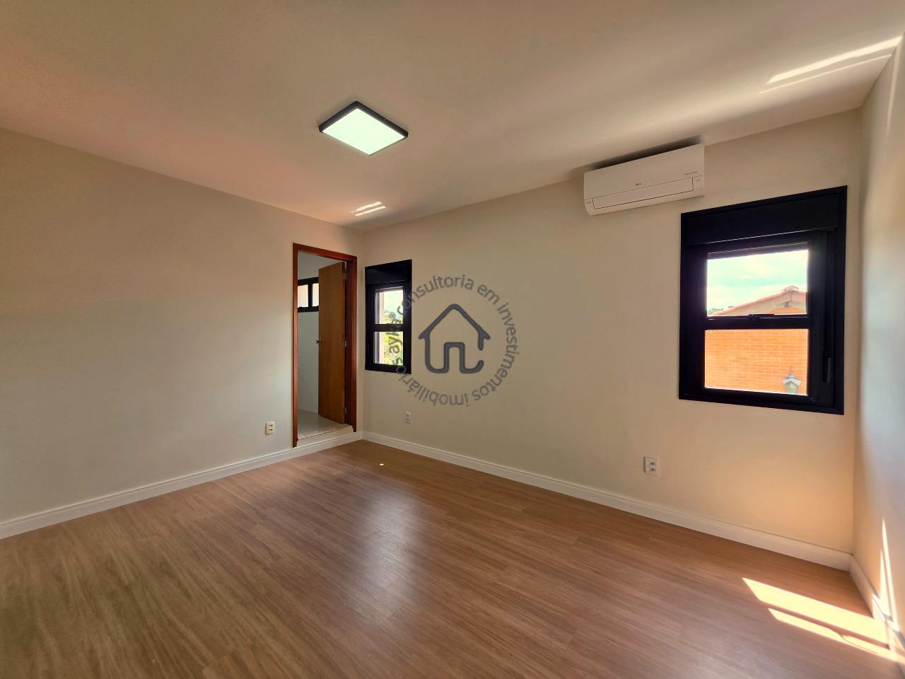 No pavimento superior estão localizadas três quartos (suítes), todas com armários planejados e ar-condicionado. A suíte master se destaca pelo closet, cuba dupla e excelente conforto, além de um espaço aberto ideal para escritório ou sala íntima. No pavimento inferior, o ambiente social é amplo e elegante, composto por sala para três ambientes com varanda e pé-direito duplo, proporcionando muita luminosidade e ventilação natural. A cozinha é equipada com armários planejados, fogão e coifa, além de contar com área de serviço e depósito ou despensa.