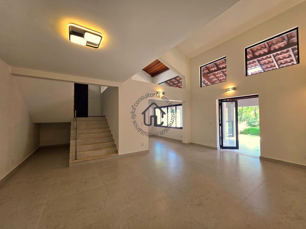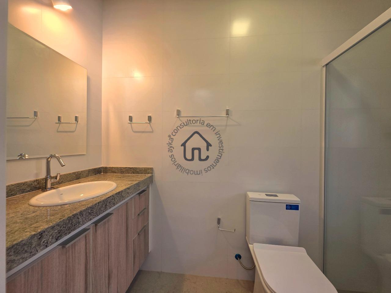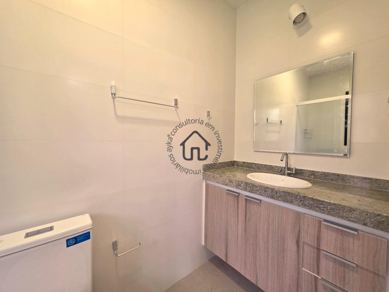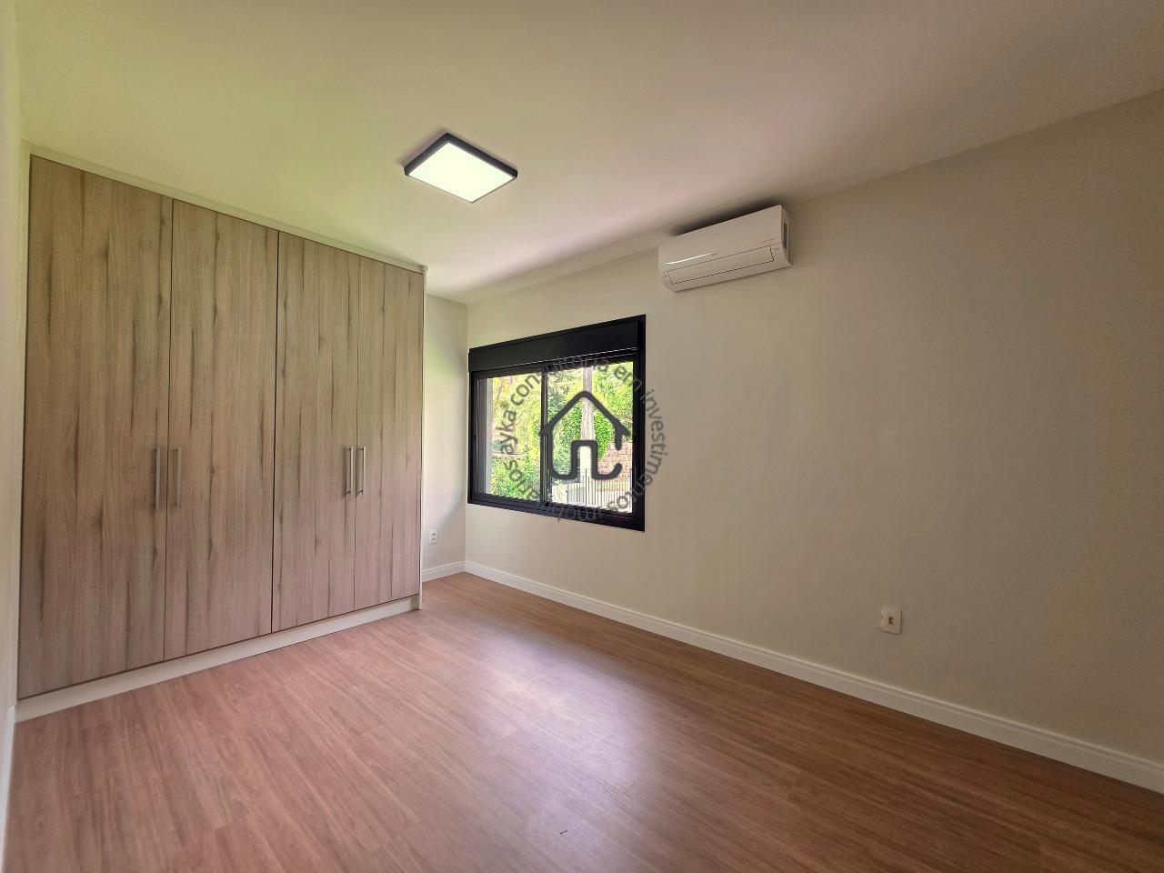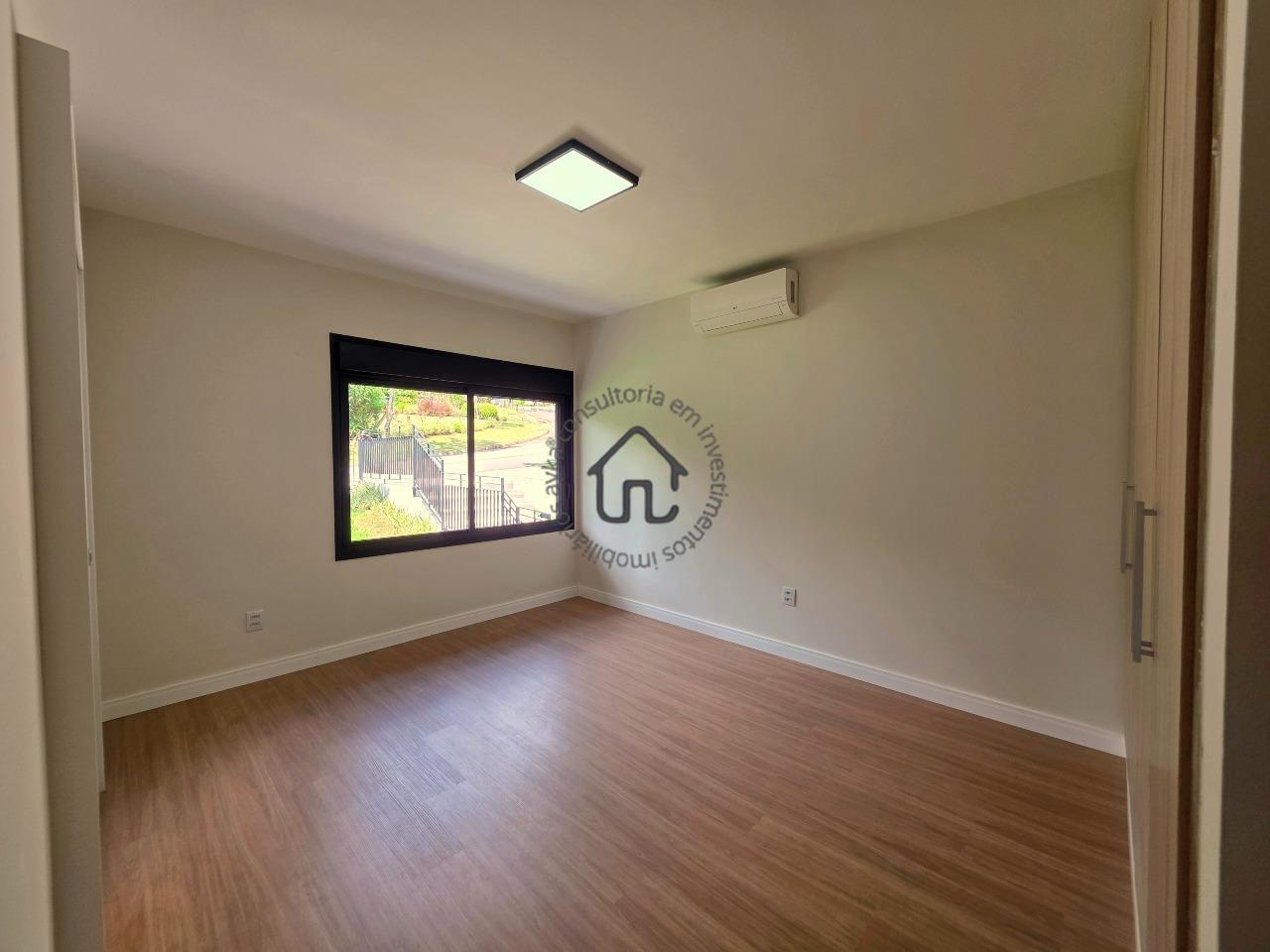 No pavimento superior estão localizadas três quartos (suítes), todas com armários planejados e ar-condicionado. A suíte master se destaca pelo closet, cuba dupla e excelente conforto, além de um espaço aberto ideal para escritório ou sala íntima. No pavimento inferior, o ambiente social é amplo e elegante, composto por sala para três ambientes com varanda e pé-direito duplo, proporcionando muita luminosidade e ventilação natural. A cozinha é equipada com armários planejados, fogão e coifa, além de contar com área de serviço e depósito ou despensa.