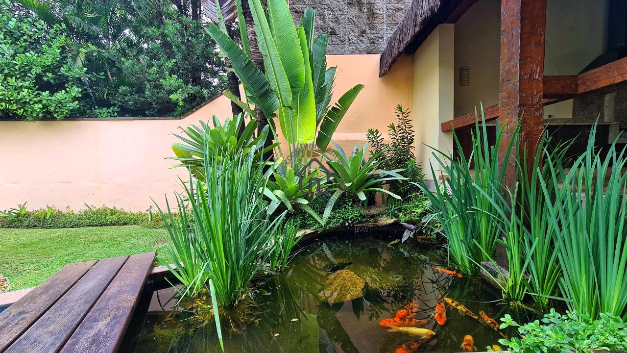 Paisagismo em estilo tropical com plantas de baixa manutenção.