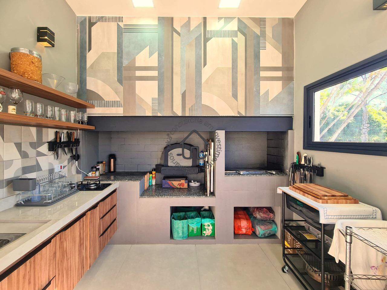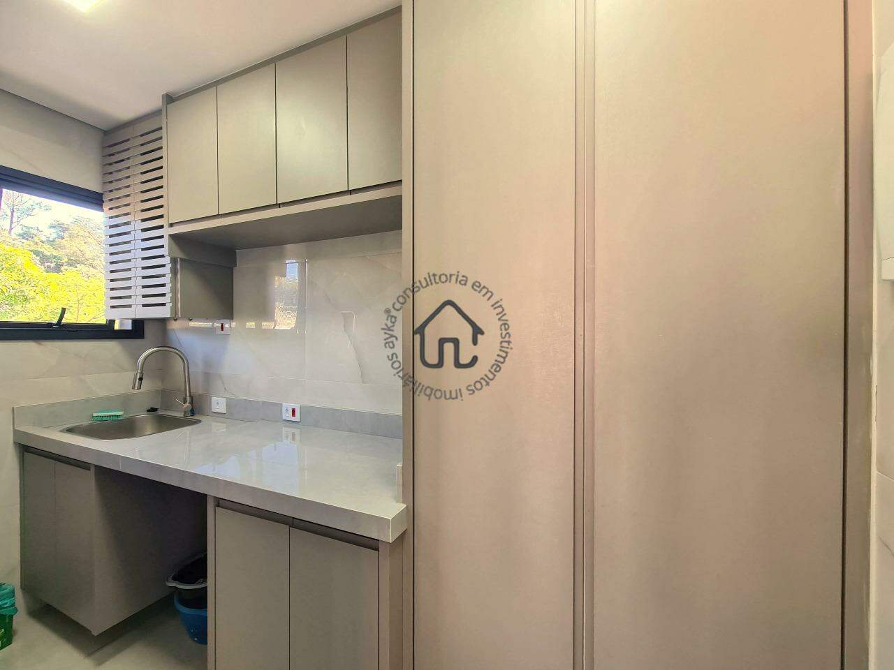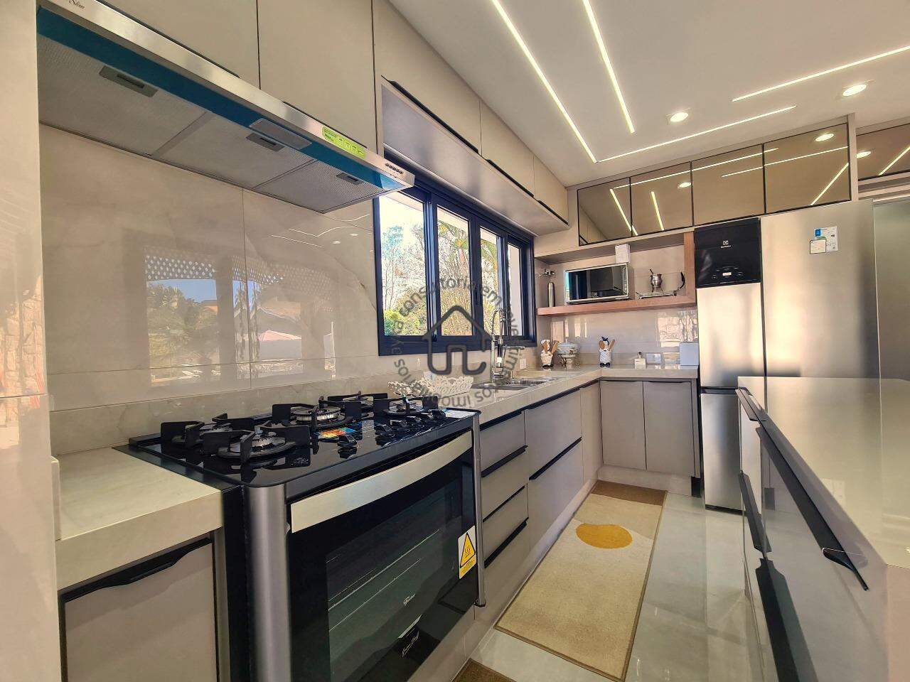 São três quartos (suítes) com ar-condicionado e persianas automatizadas, sala avarandada com lareira para dois ambientes (excelente iluminação natural), lavabo, cozinha com design moderno e mobiliário planejado (incluso forno, fogão, geladeira e depurador de ar), despensa e área de serviço.