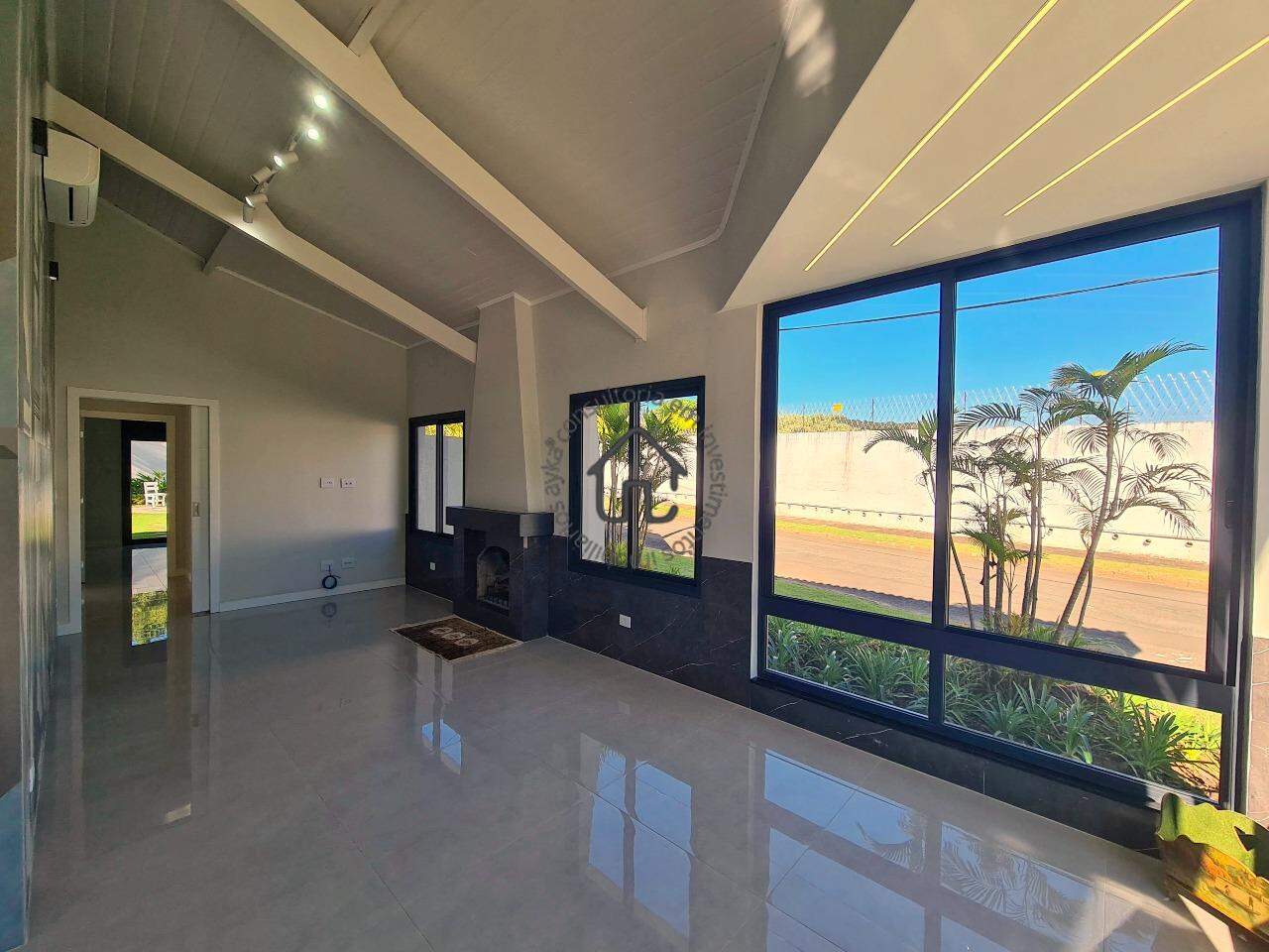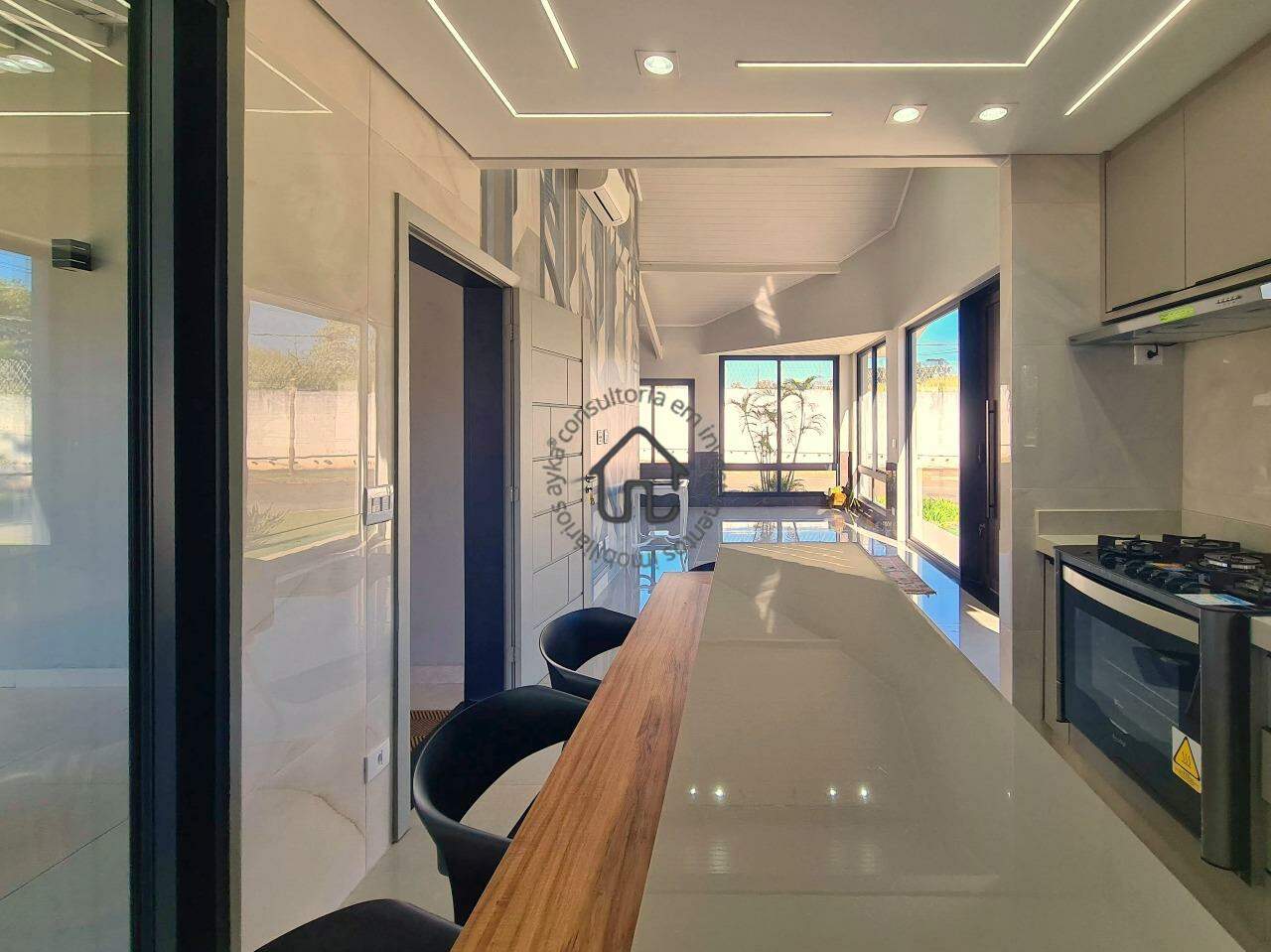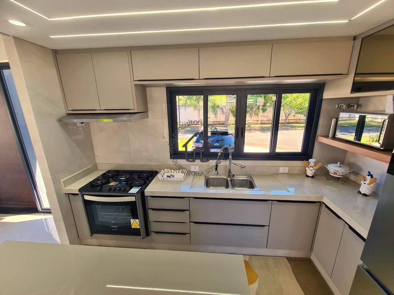 São três quartos (suítes) com ar-condicionado e persianas automatizadas, sala avarandada com lareira para dois ambientes (excelente iluminação natural), lavabo, cozinha com design moderno e mobiliário planejado (incluso forno, fogão, geladeira e depurador de ar), despensa e área de serviço.