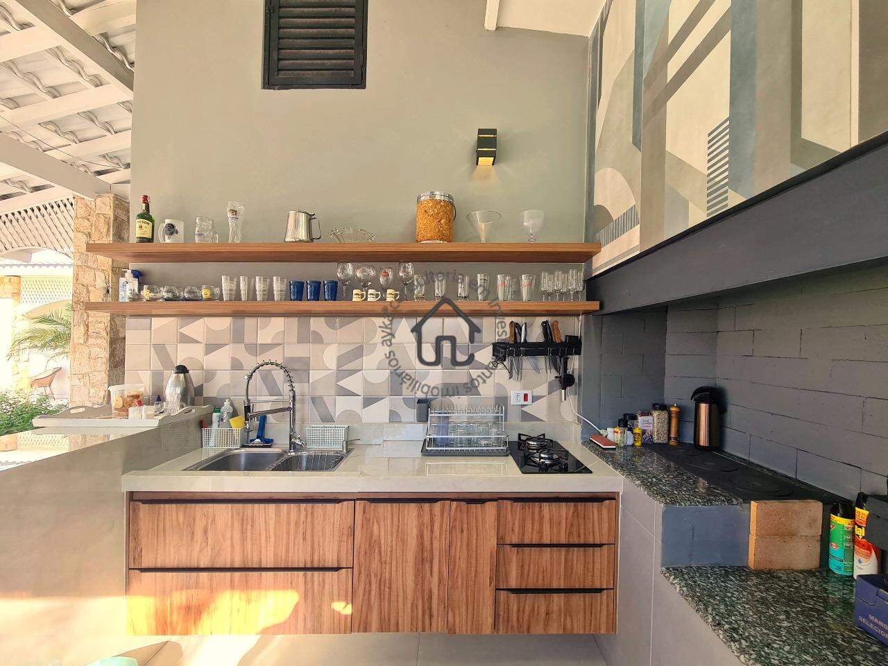 Área gourmet com cooktop, churrasqueira, forno de pizza, forno a lenha e banheiro social.