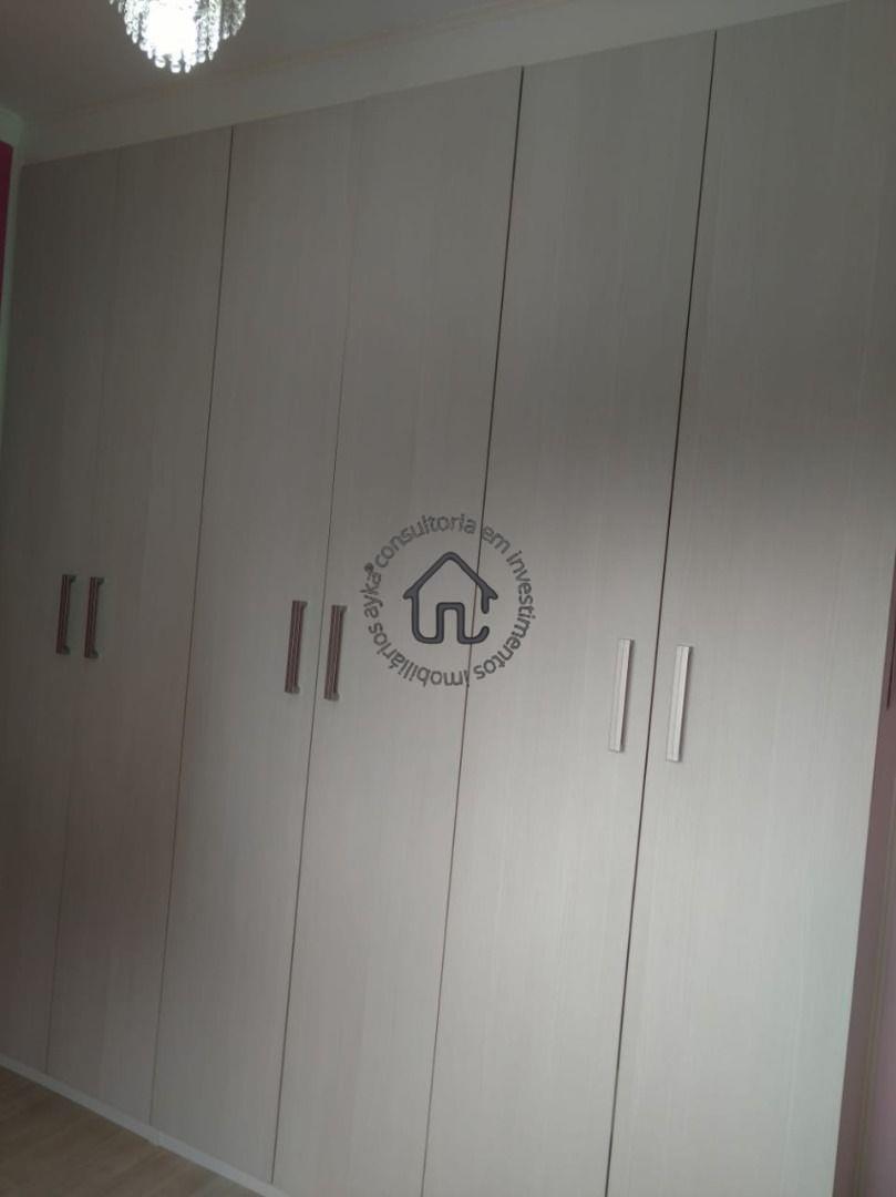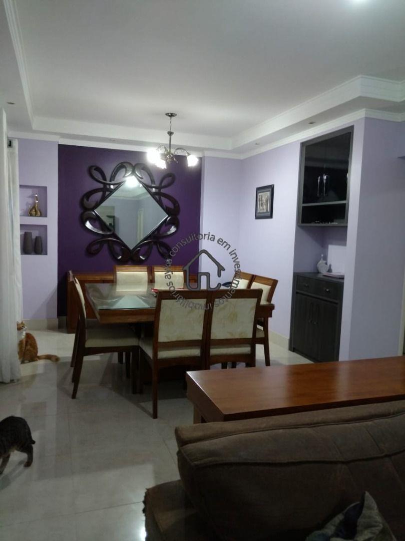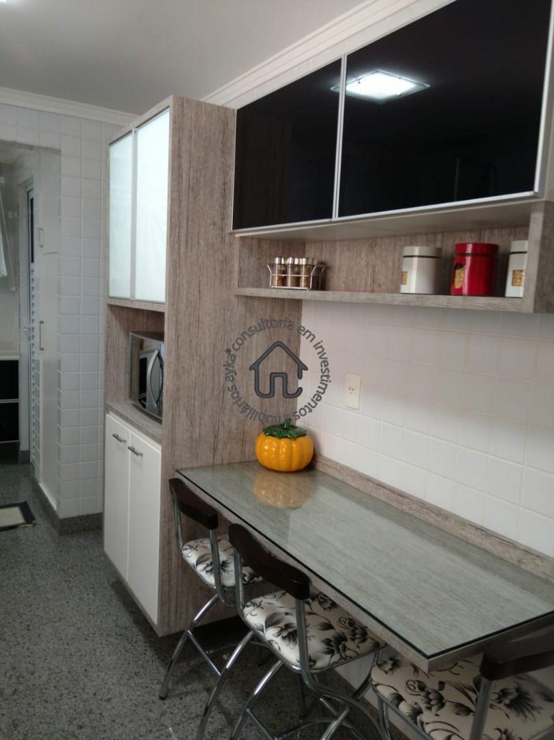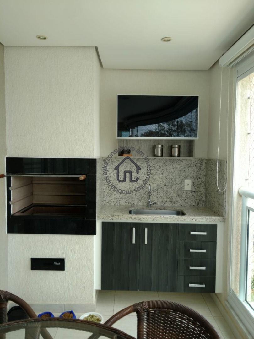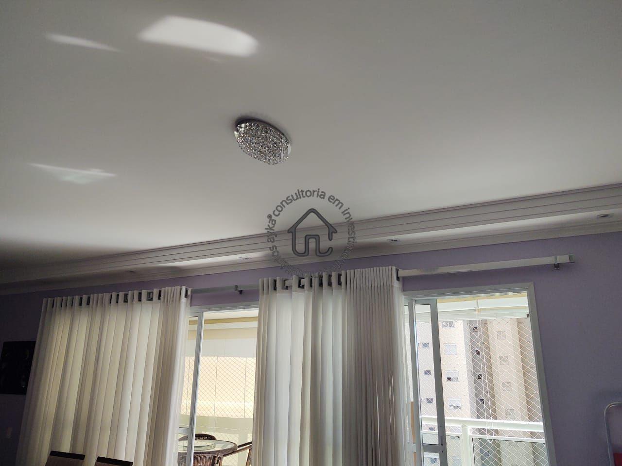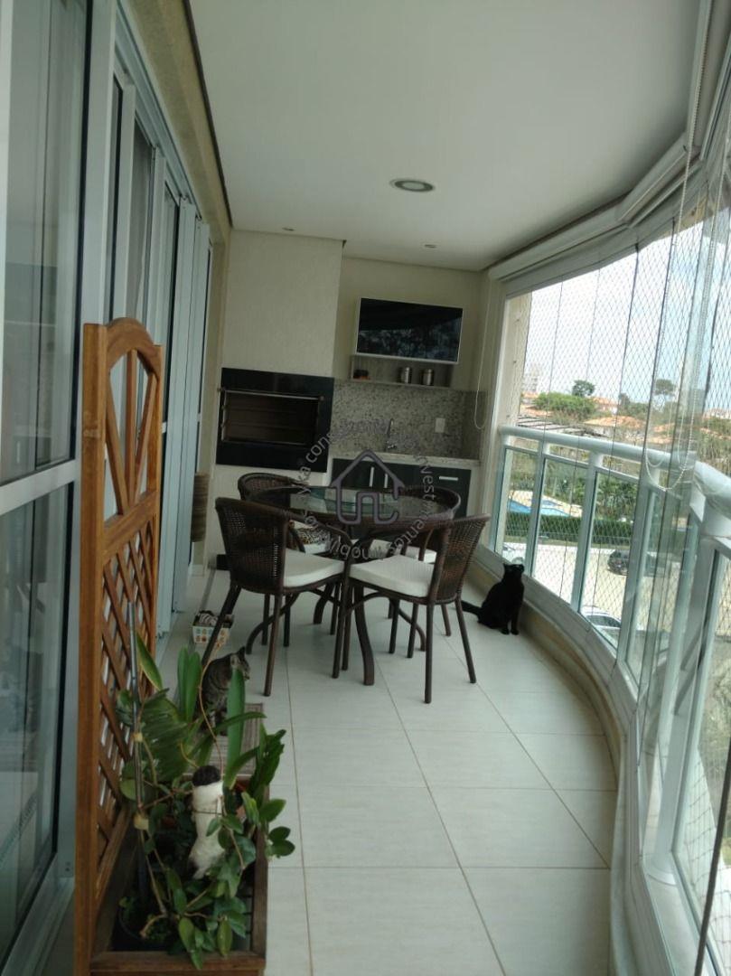 São três suítes (duas com armários), living para três ambientes integrado com varanda gourmet fechada (vidro e persiana), banheiro social, cozinha com armários planejados e área de serviço com banheiro privativo.