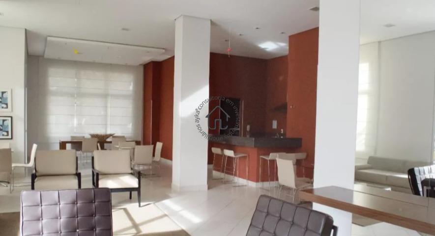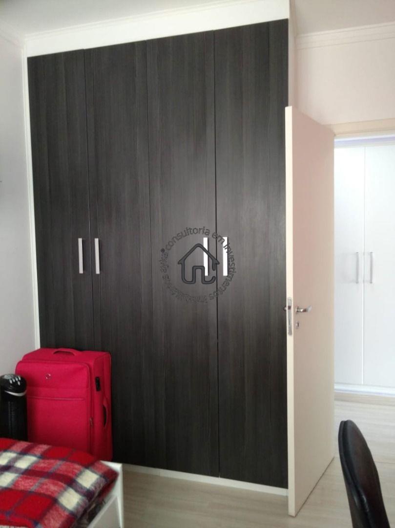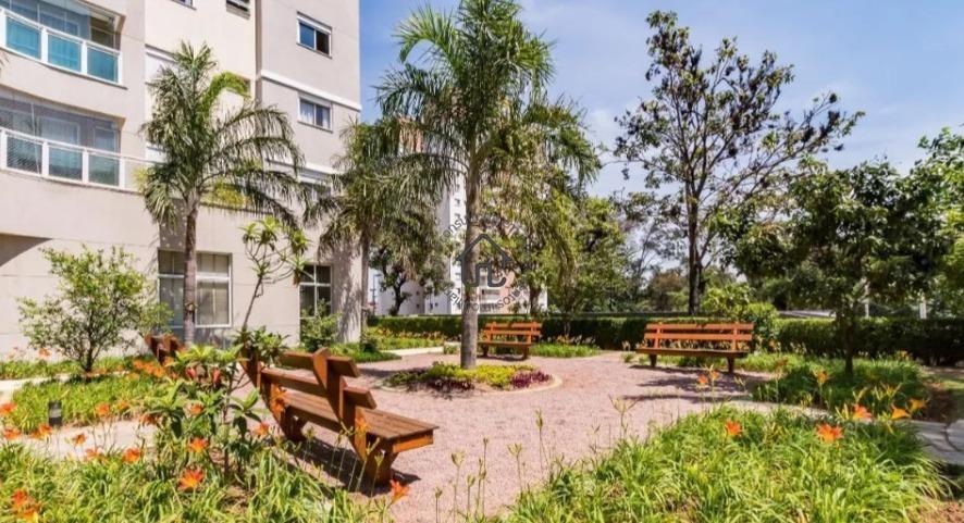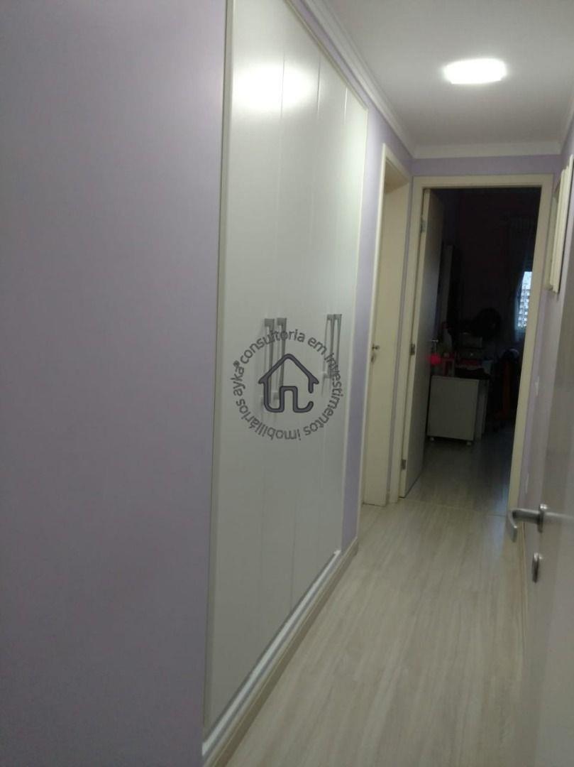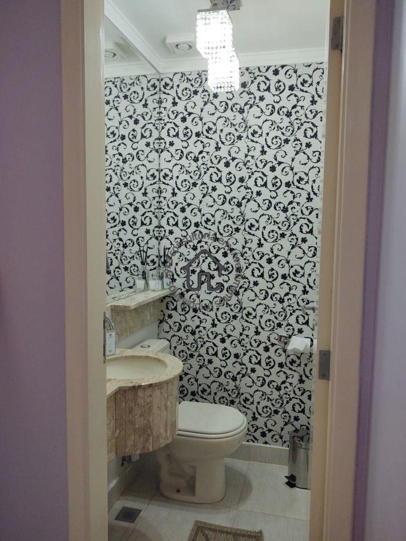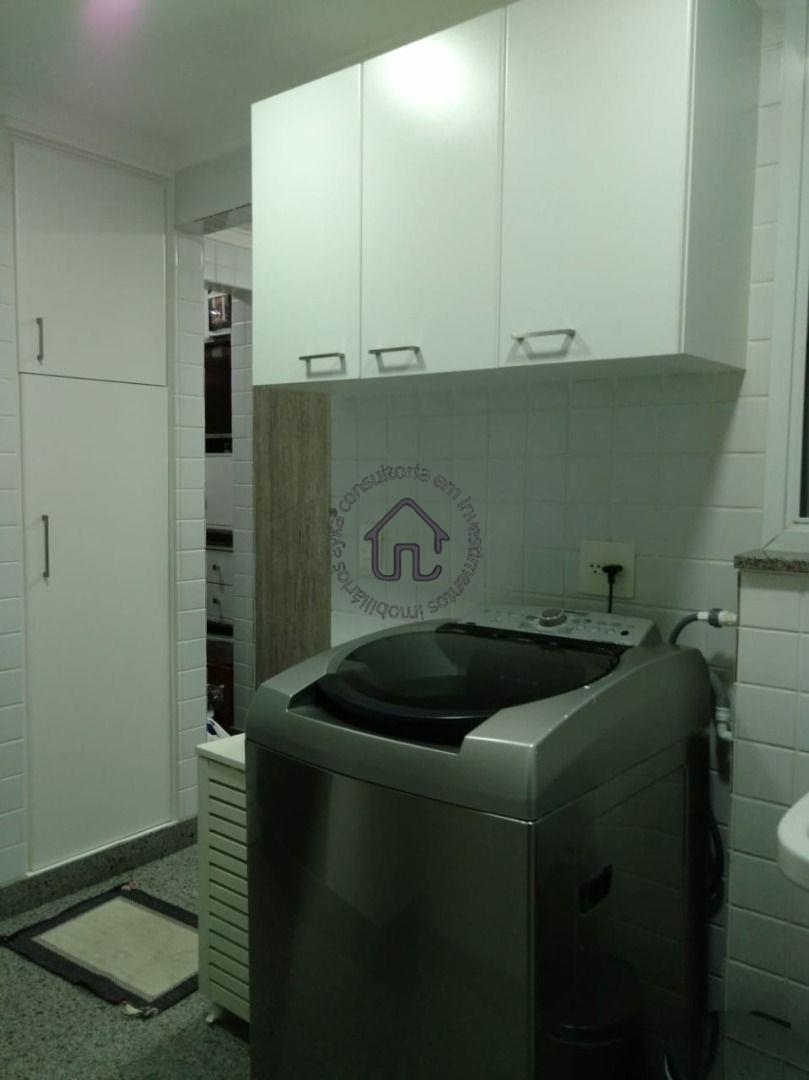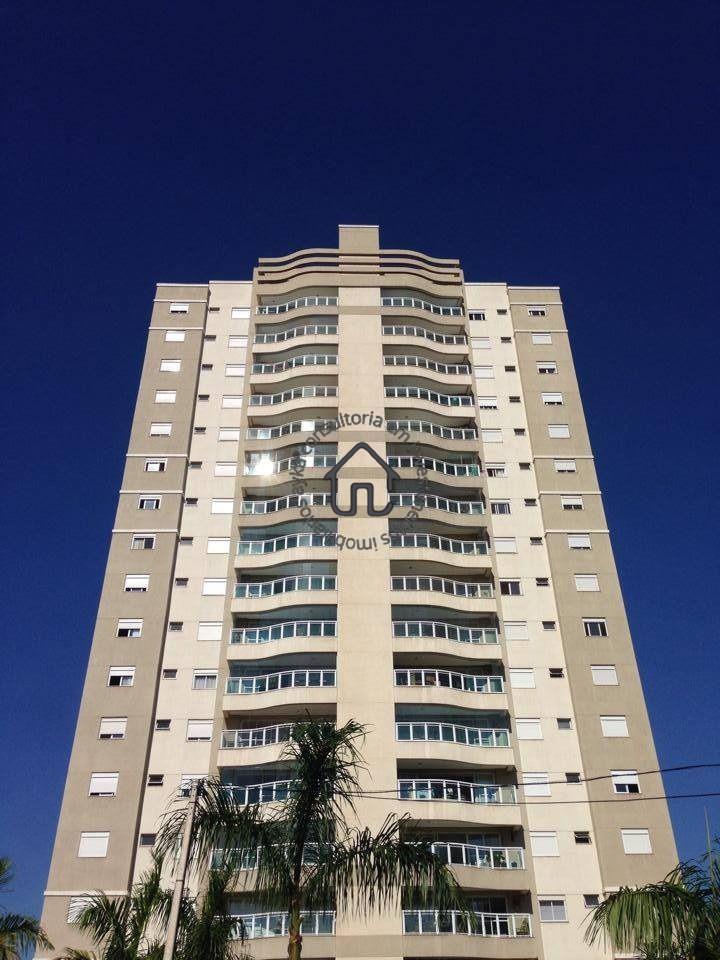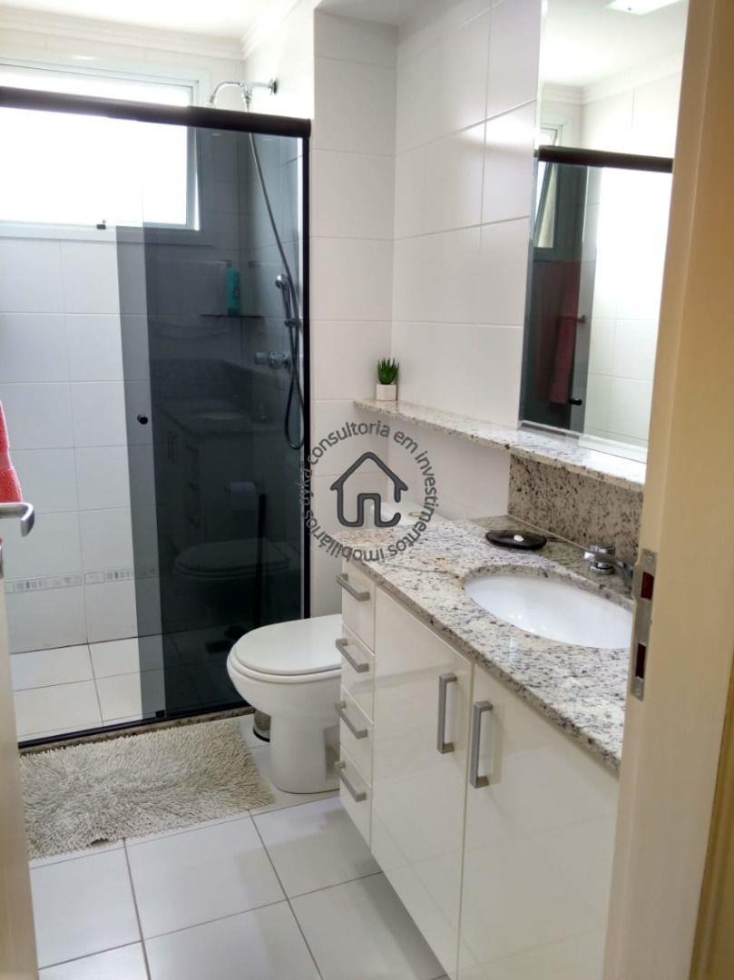 São três suítes (duas com armários), living para três ambientes integrado com varanda gourmet fechada (vidro e persiana), banheiro social, cozinha com armários planejados e área de serviço com banheiro privativo.