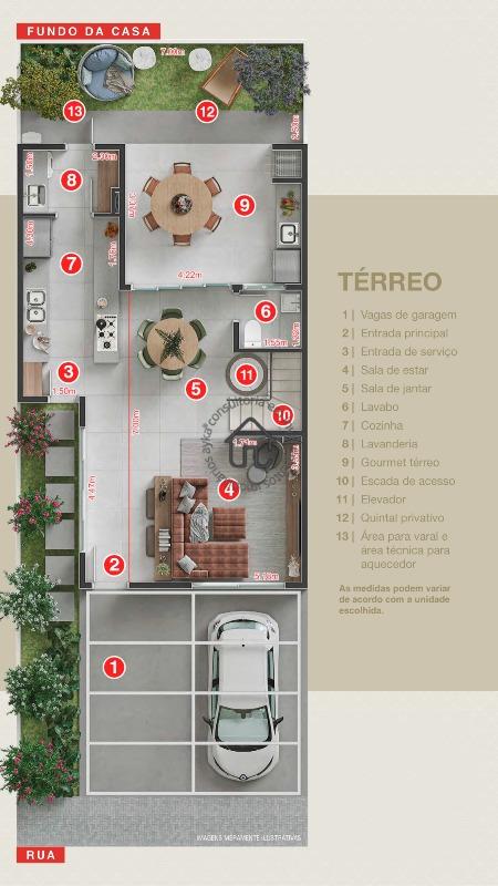 O empreendimento será construído em um terreno de 25.999,02 m², com 122 casas de 208 m², incluindo rooftop e duas vagas de garagem. As residências possuem quatro opções de fachada: