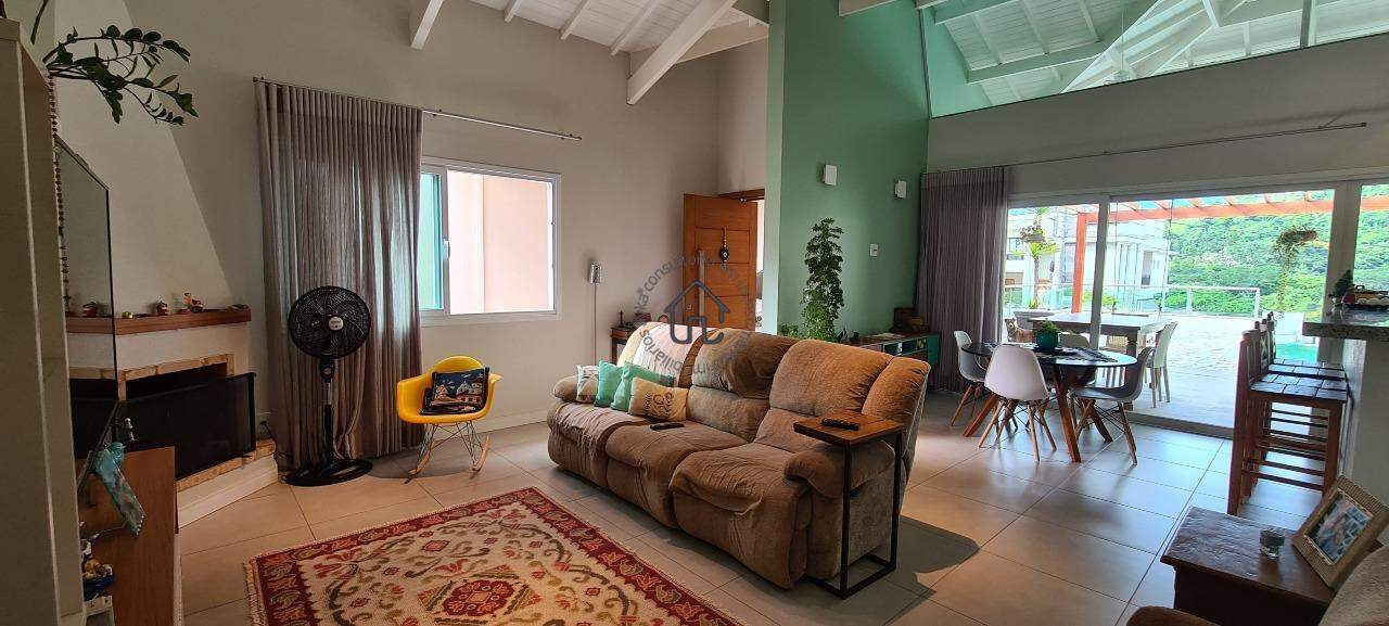 Sala para dois ambientes com lareira conjugada com cozinha, área gourmet e piscina.