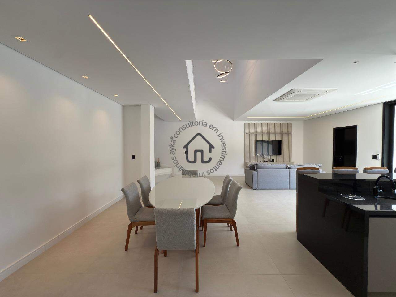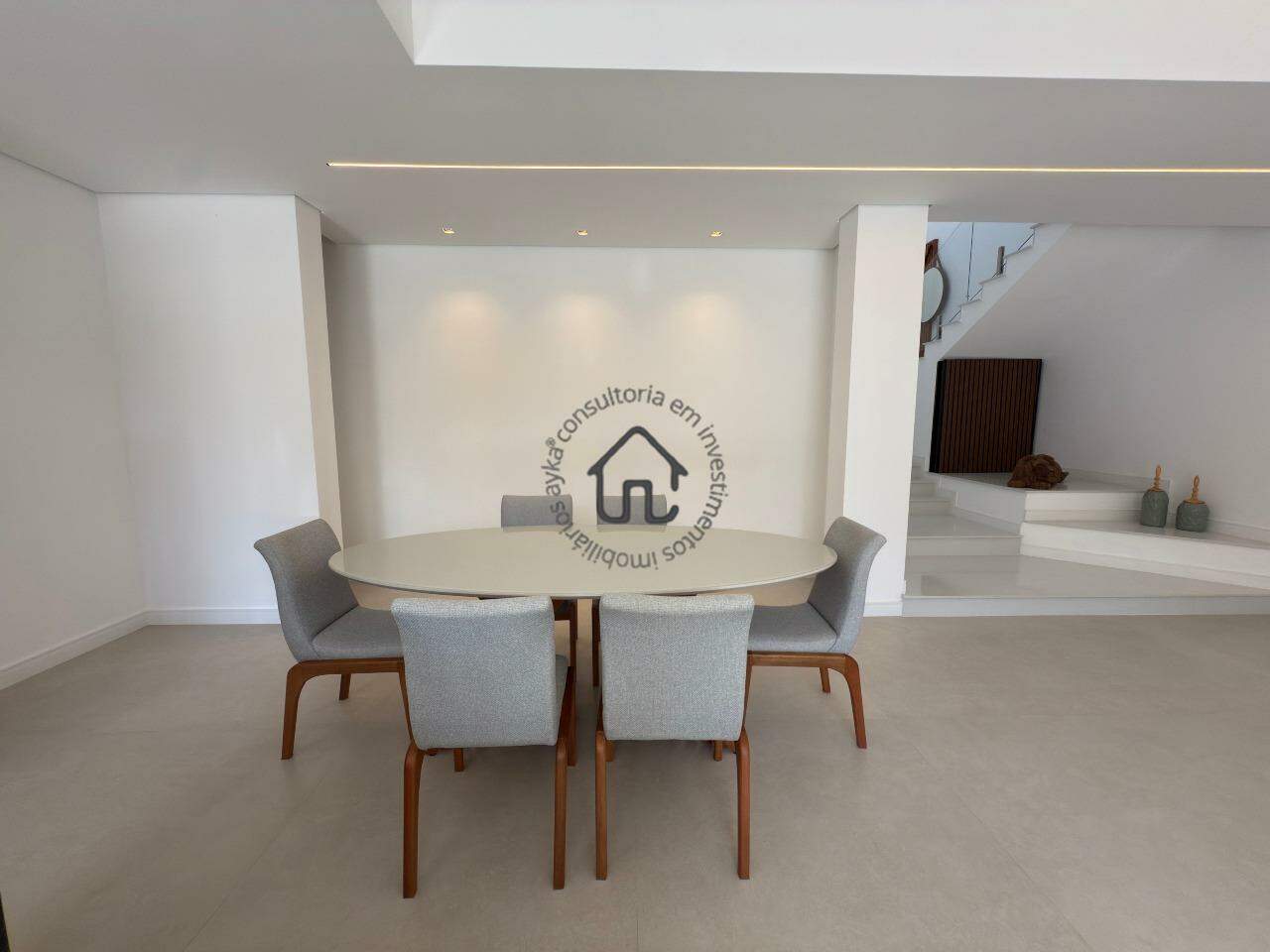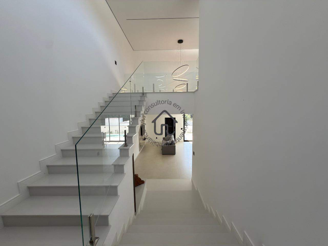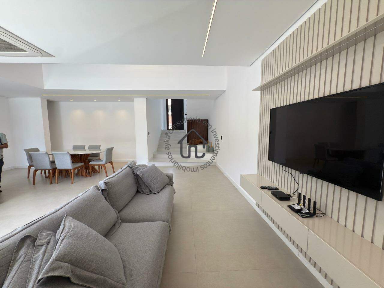 No térreo, a casa oferece uma ampla sala com ar-condicionado central integrada à cozinha e sala de jantar, além de uma suíte térrea, lavabo e lavanderia.
