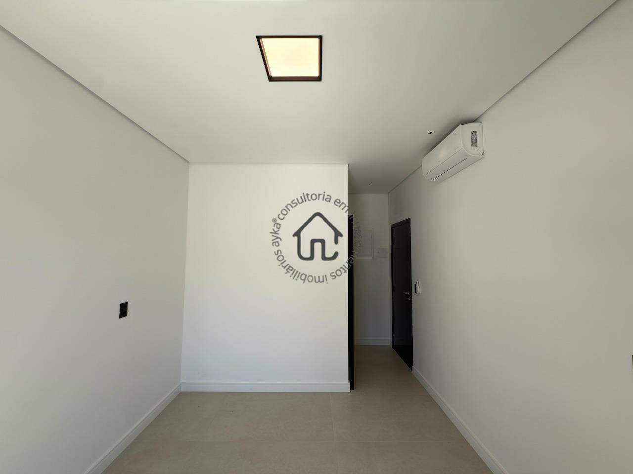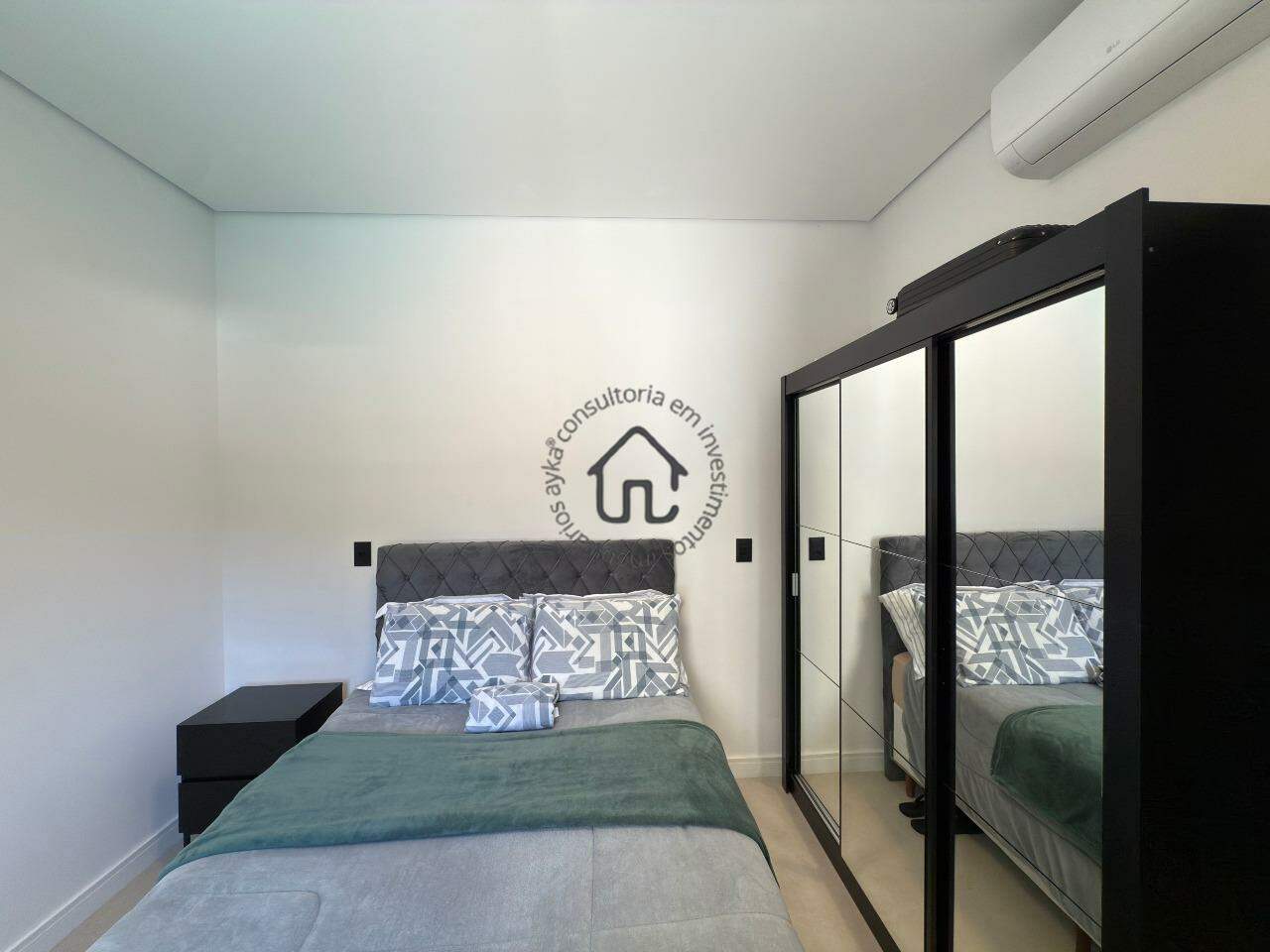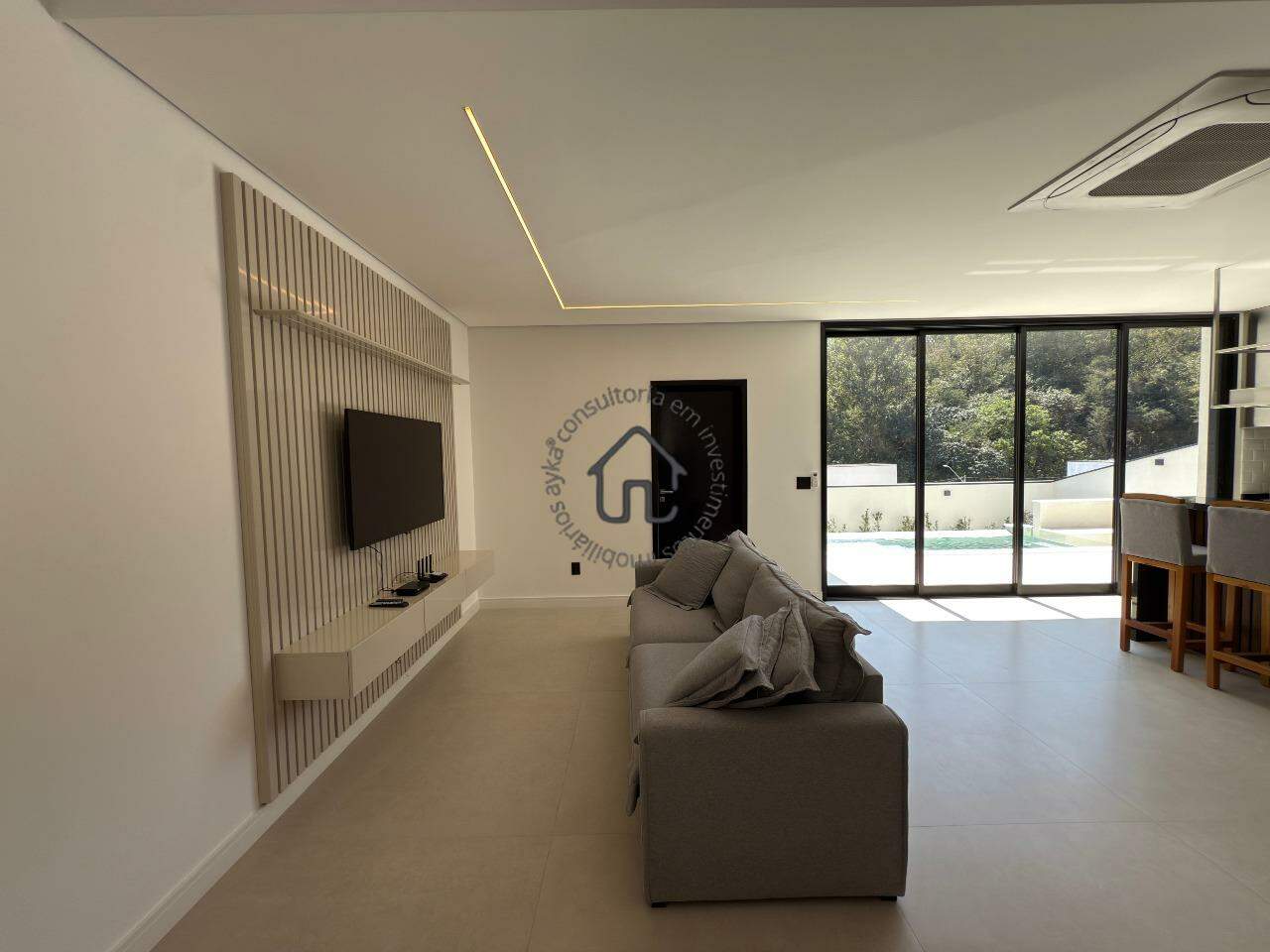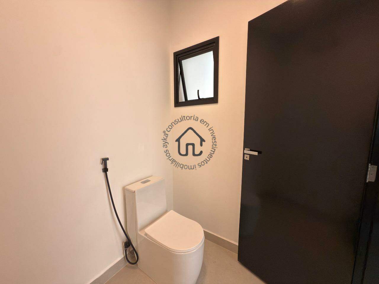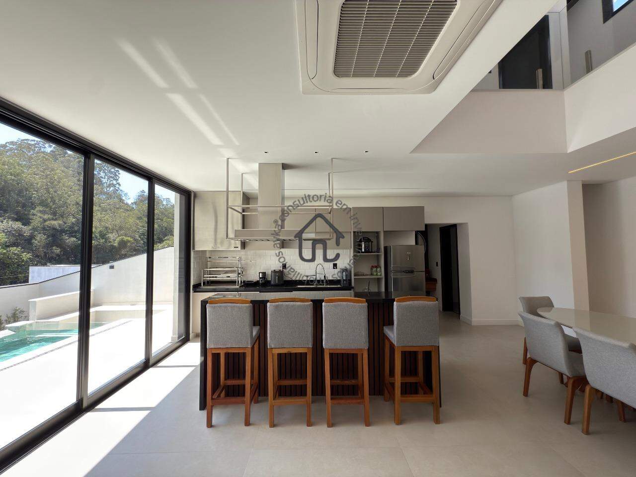 No térreo, a casa oferece uma ampla sala com ar-condicionado central integrada à cozinha e sala de jantar, além de uma suíte térrea, lavabo e lavanderia.