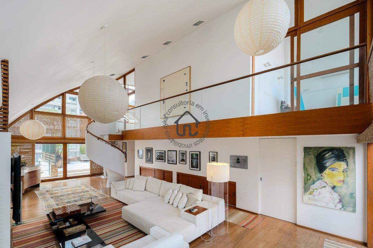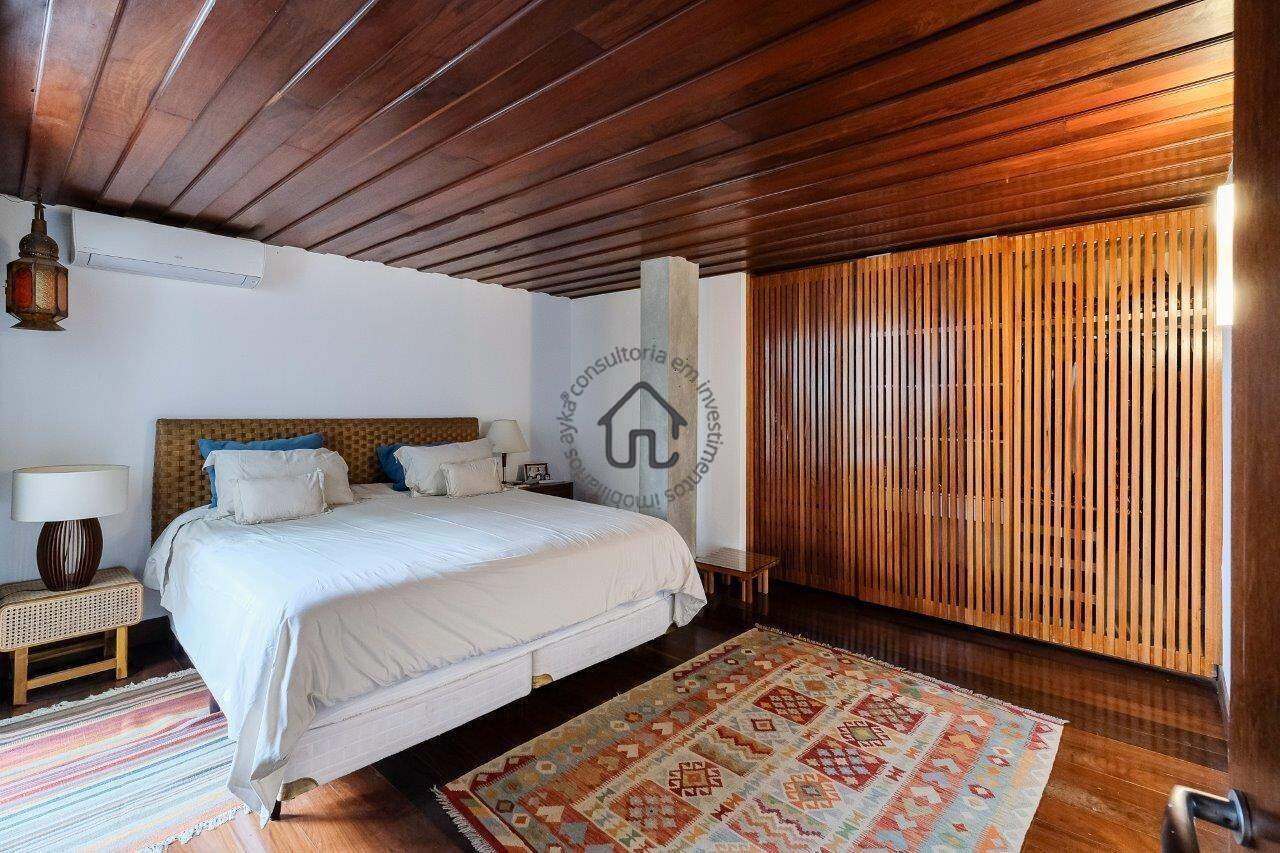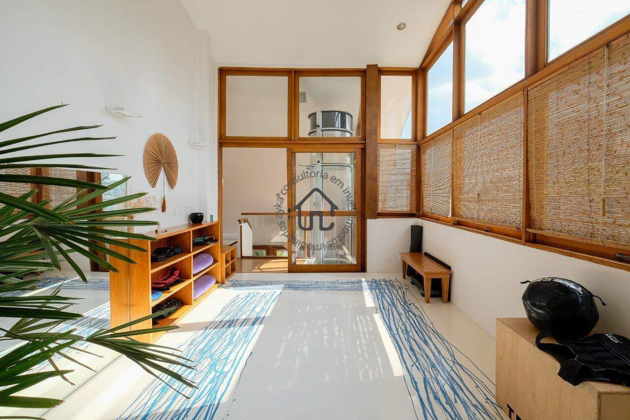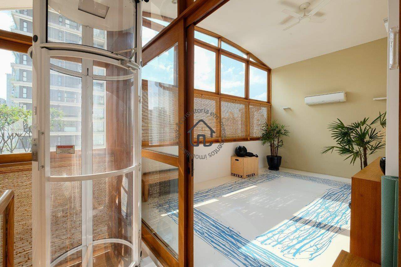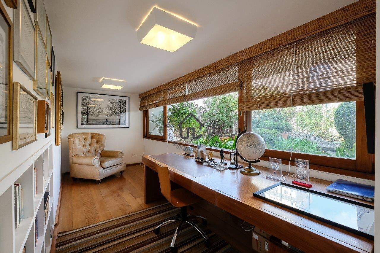 No andar superior, o pé-direito duplo e as portas de vidro conferem imponência e amplitude ao espaço, que também conta com lareira e um escritório reservado, ideal para quem trabalha de casa com conforto e elegância. Um mezanino multifuncional abriga atualmente um ateliê e um estúdio de Pilates, podendo ser adaptado conforme a necessidade do novo morador.
