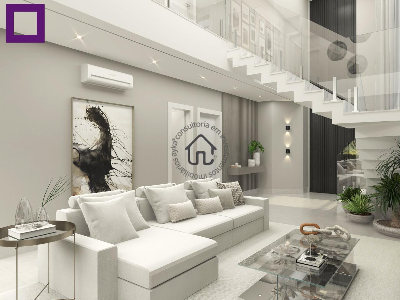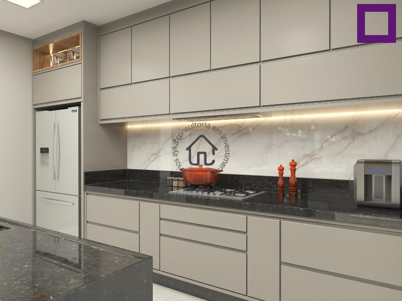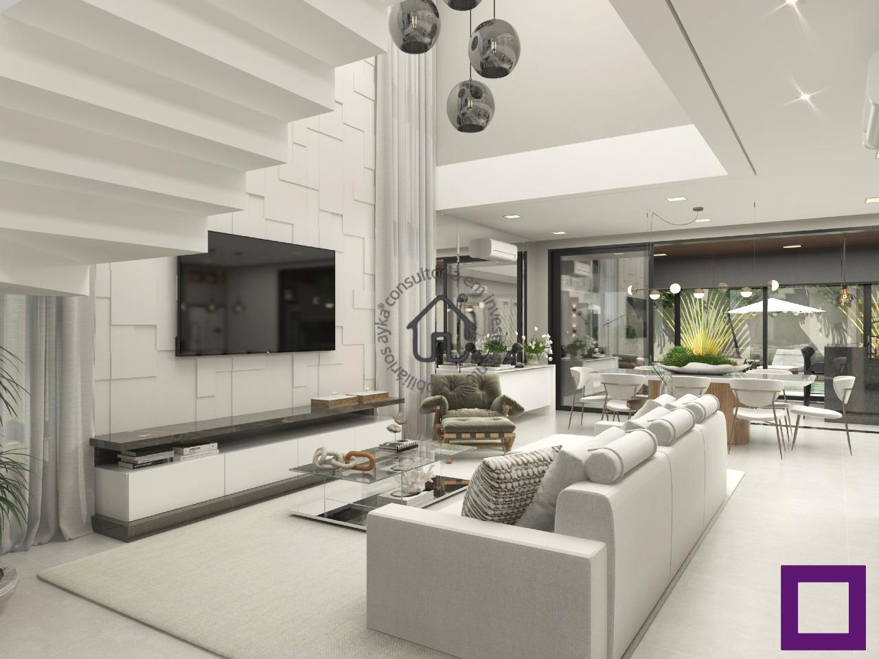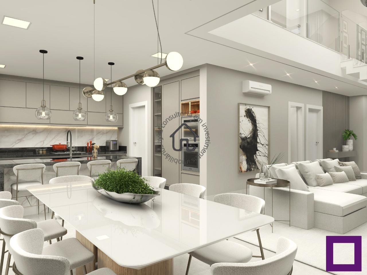 Ampla sala para dois ambientes com pé-direito elevado (excelente iluminação natural), lavabo, escritório, cozinha com design moderno e mobiliário planejado, despensa e área de serviço.
