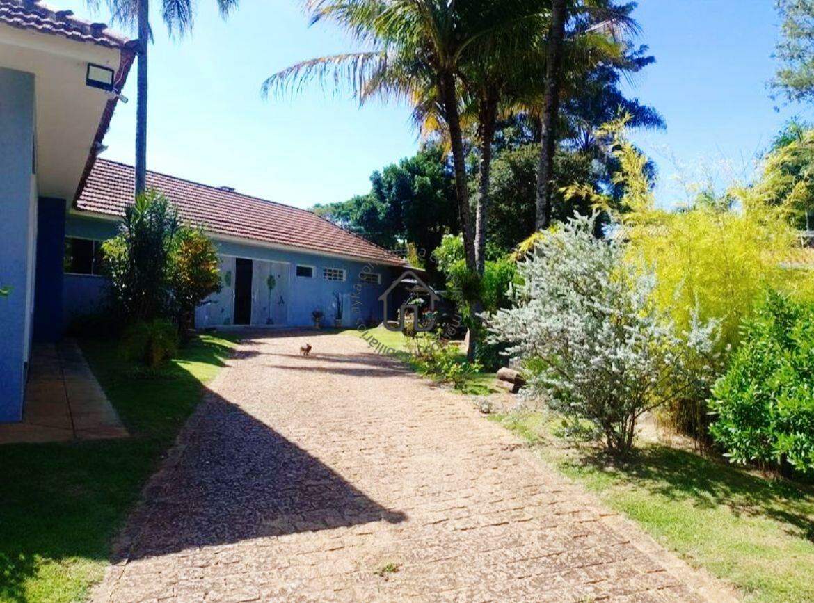 A casa principal oferece 3 quartos, incluindo uma suíte, uma sala de estar com lareira e uma cozinha ampla. Na área externa, há um canil, gatil, piscina e um amplo jardim com árvores frutíferas.