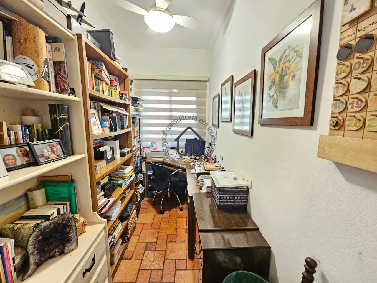 Sala avarandada para dois ambientes com banheiro social, escritório, cozinha com armários e área de serviço.