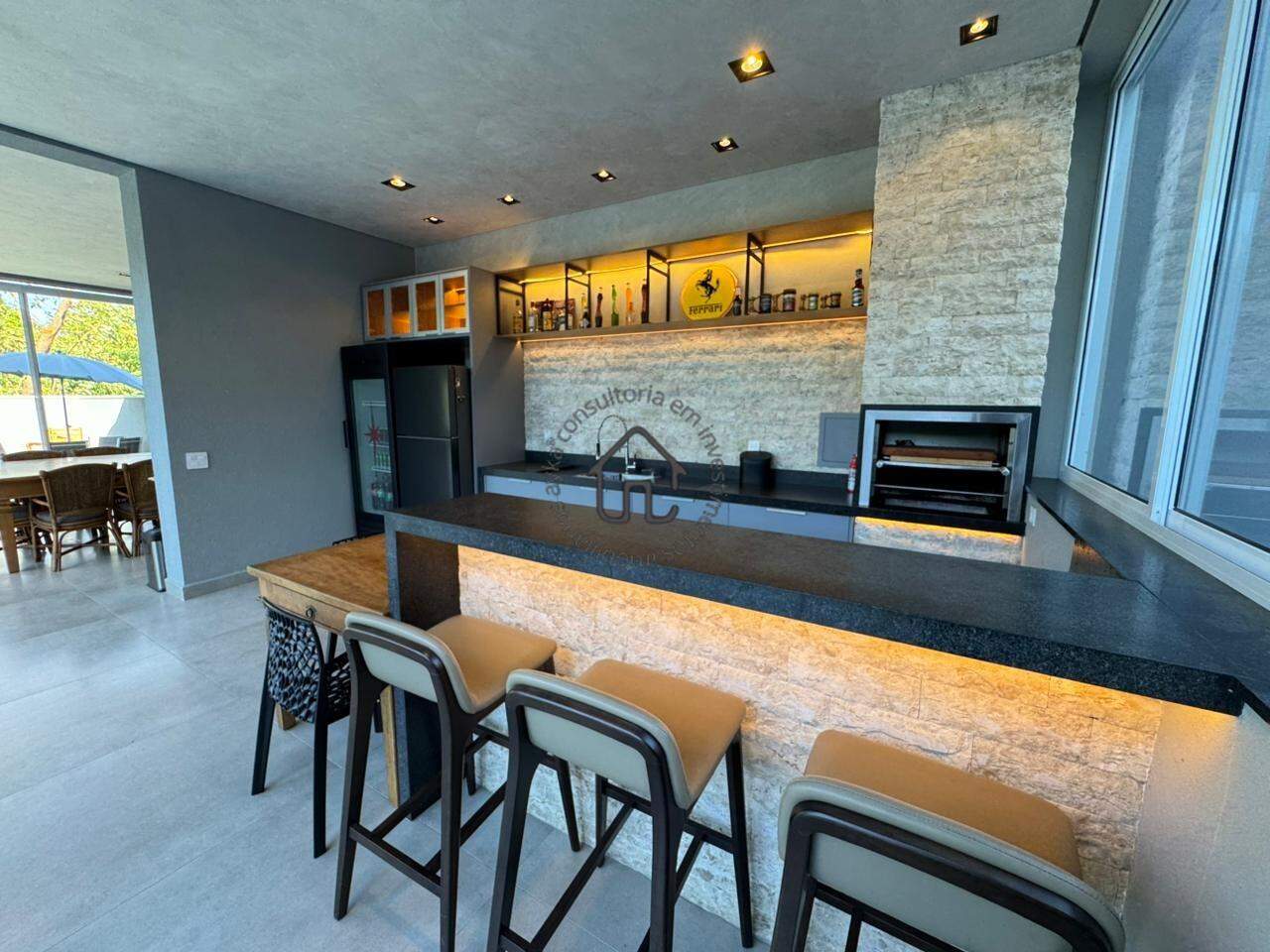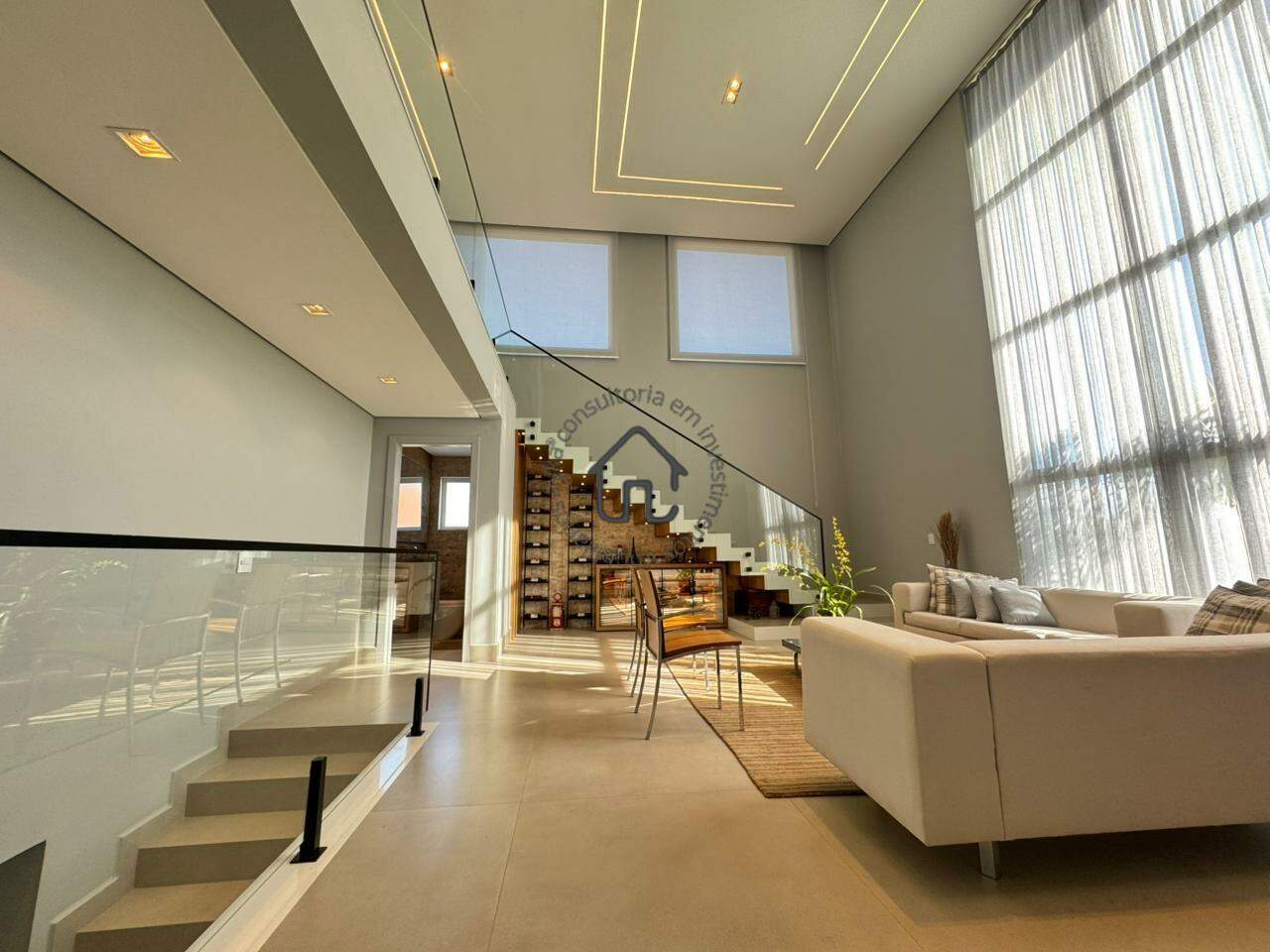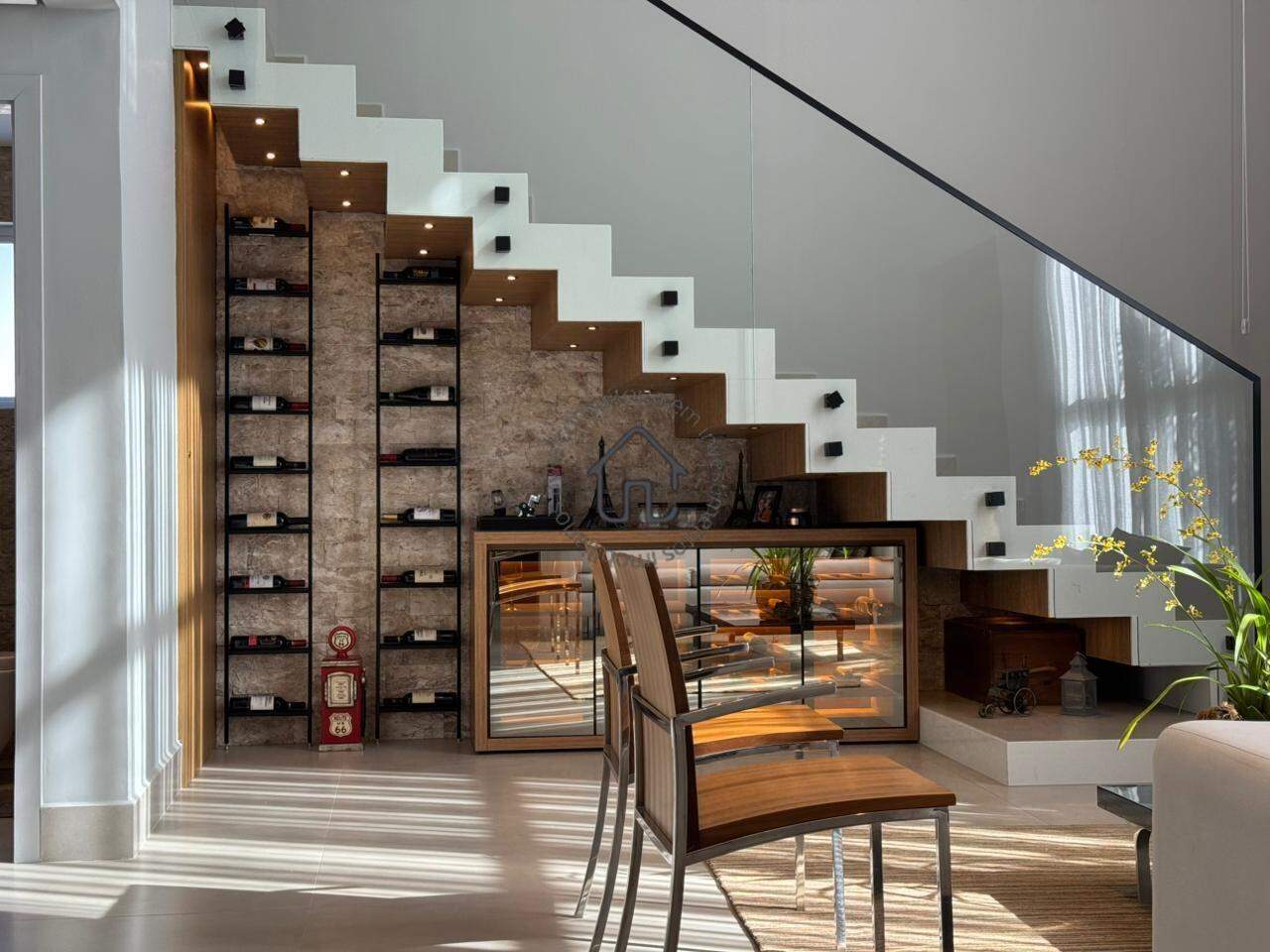 A área social foi pensada para inspirar convivência e acolhimento. Conta com sala de estar com pé-direito duplo, ambiente de TV reservado, adega, cozinha integrada com ilha central e um projeto moderno e funcional que se conecta perfeitamente à área gourmet.