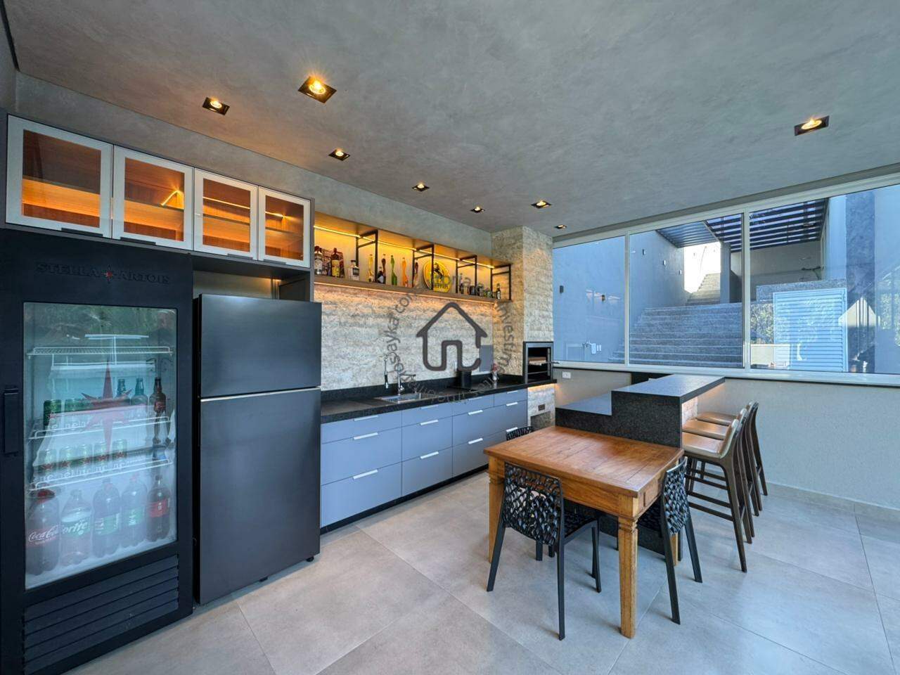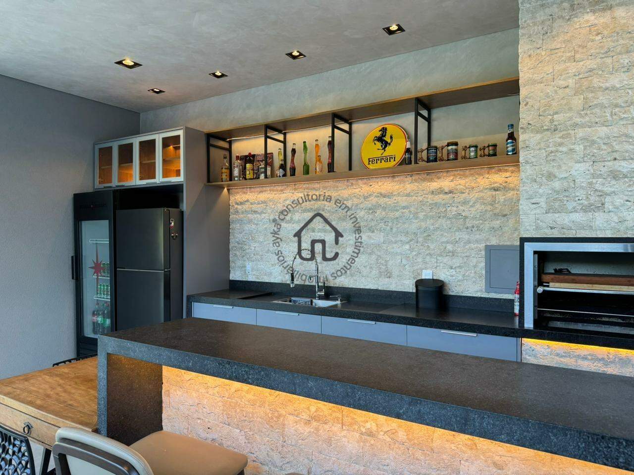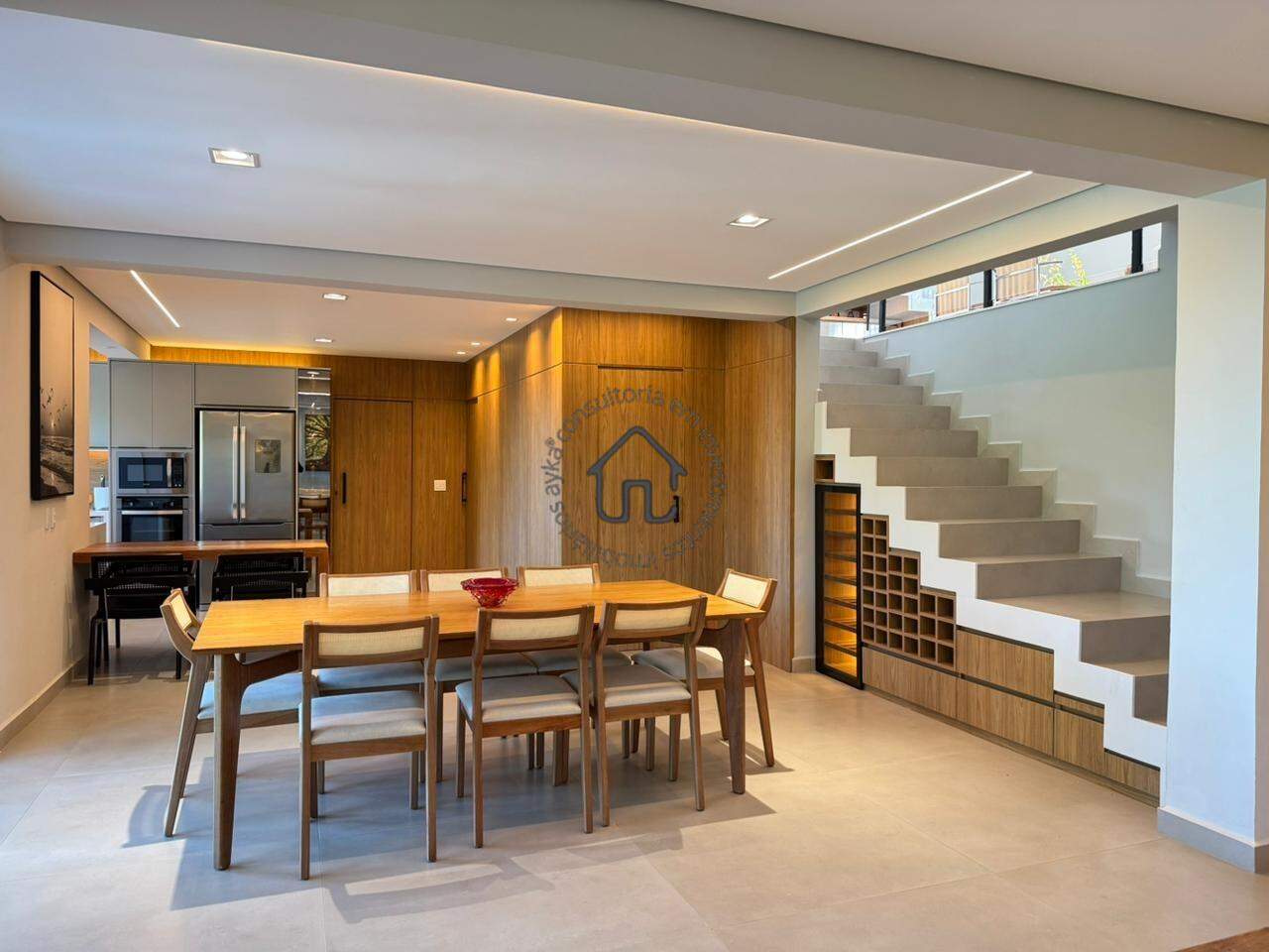 A área social foi pensada para inspirar convivência e acolhimento. Conta com sala de estar com pé-direito duplo, ambiente de TV reservado, adega, cozinha integrada com ilha central e um projeto moderno e funcional que se conecta perfeitamente à área gourmet.