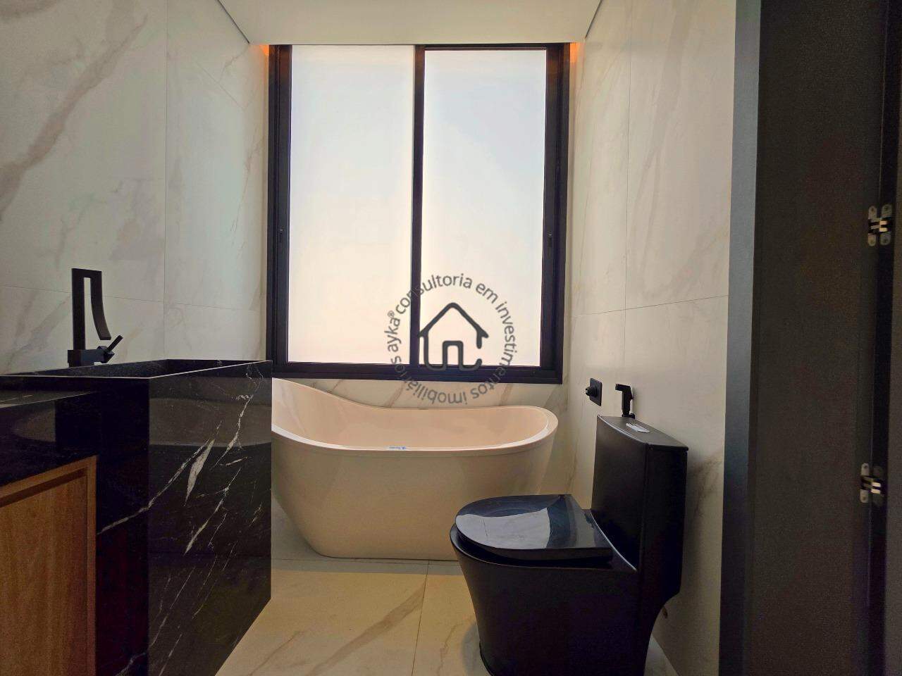 Ampla sala para dois ambientes com pé-direito elevado, sala de cinema privativa, lavabo, cozinha com layout moderno e mobiliário planejado, despensa e área de serviço.