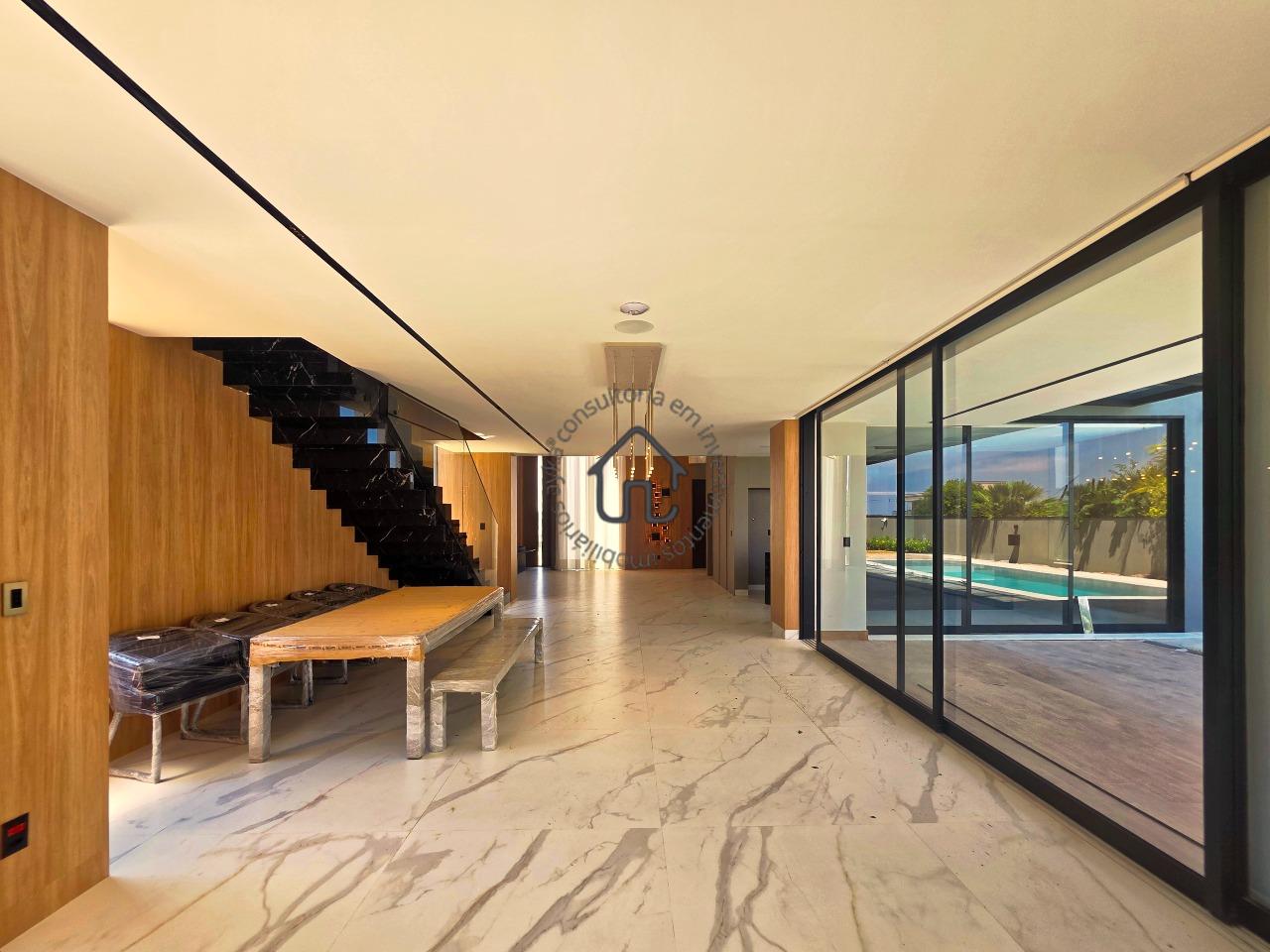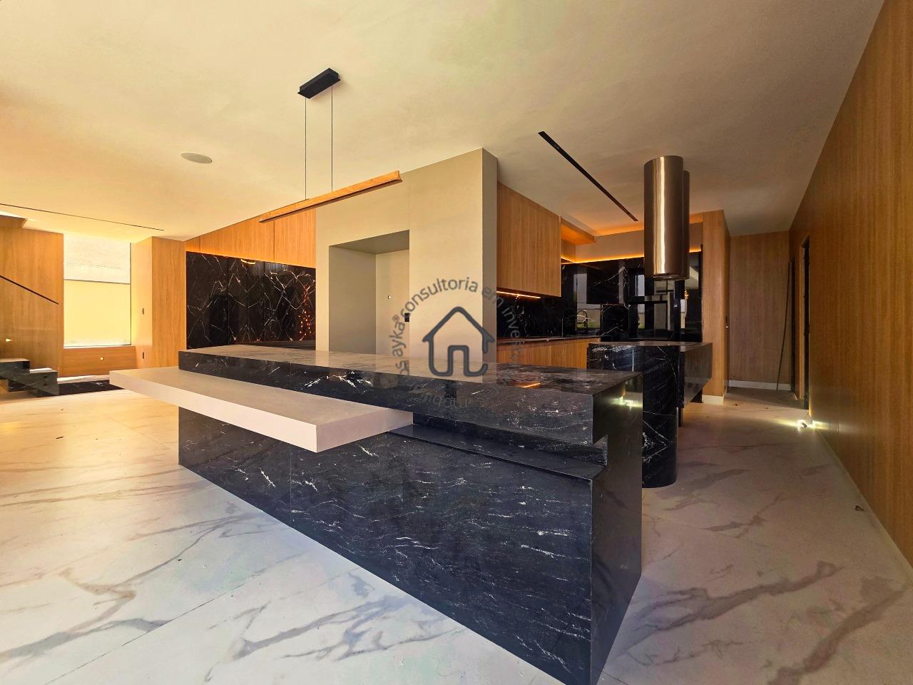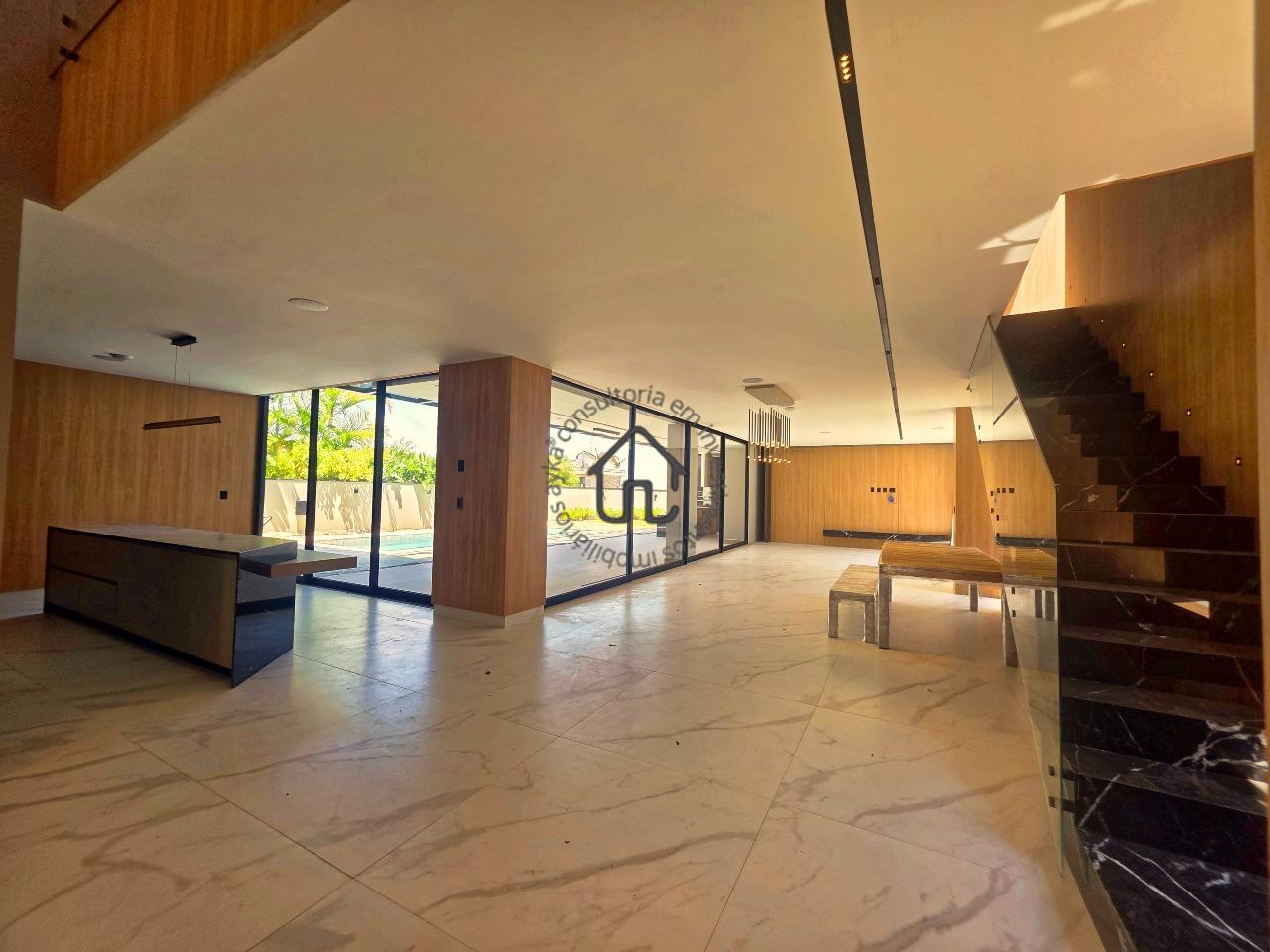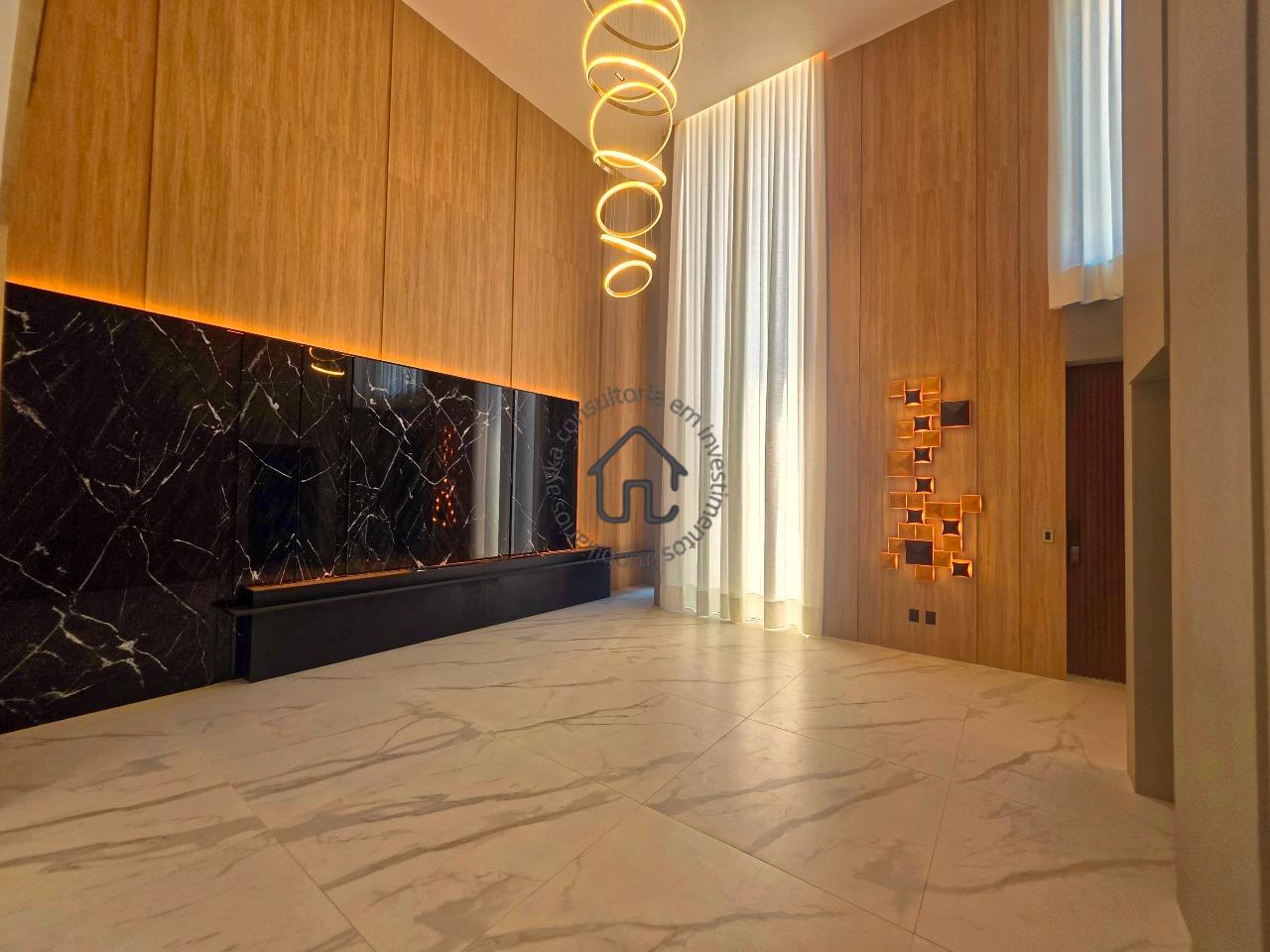 Ampla sala para dois ambientes com pé-direito elevado, sala de cinema privativa, lavabo, cozinha com layout moderno e mobiliário planejado, despensa e área de serviço.