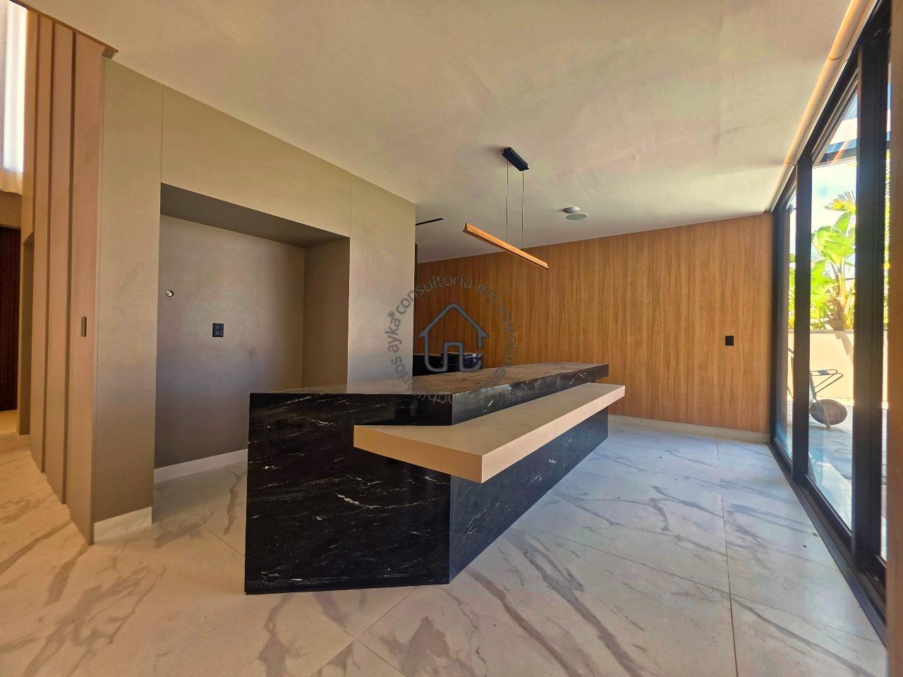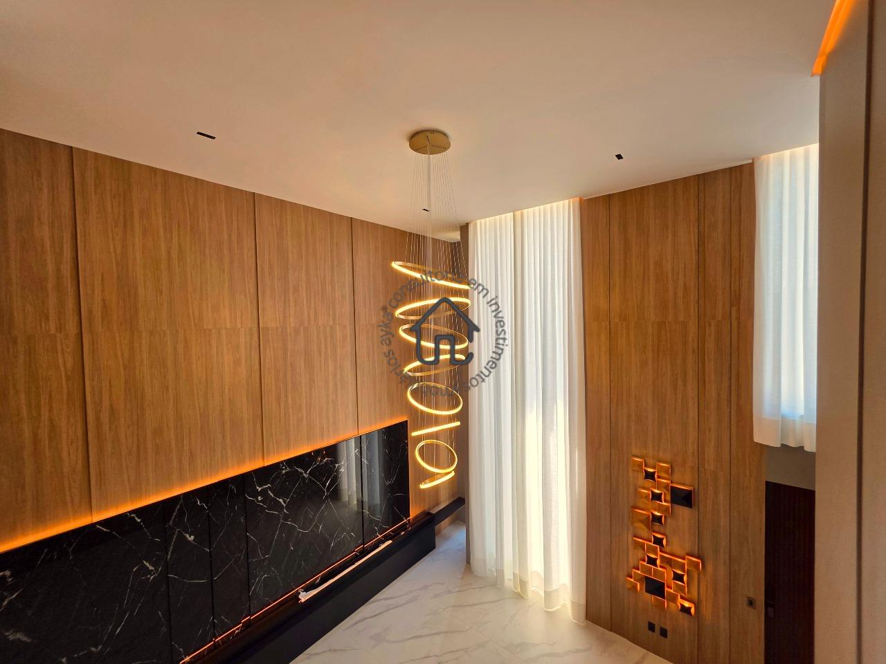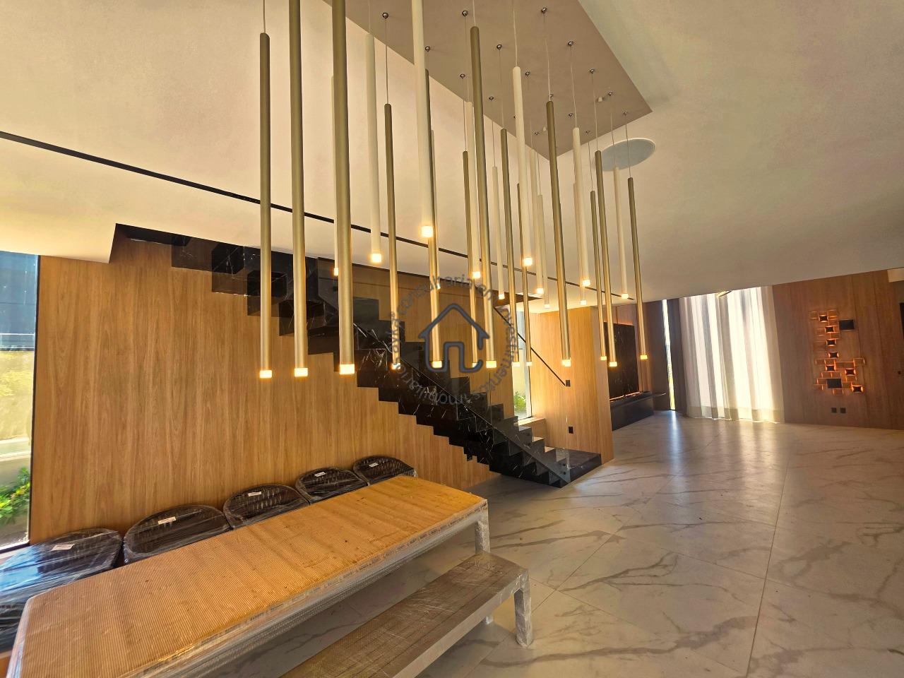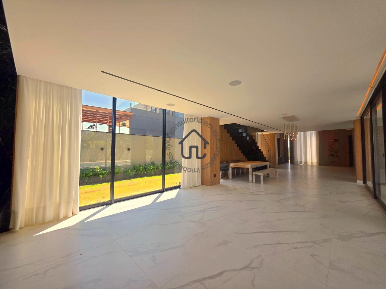 Ampla sala para dois ambientes com pé-direito elevado, sala de cinema privativa, lavabo, cozinha com layout moderno e mobiliário planejado, despensa e área de serviço.
