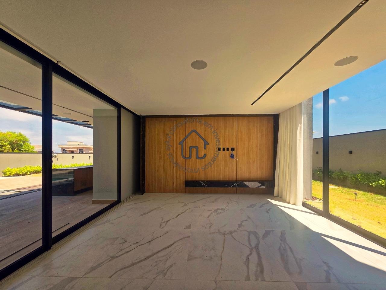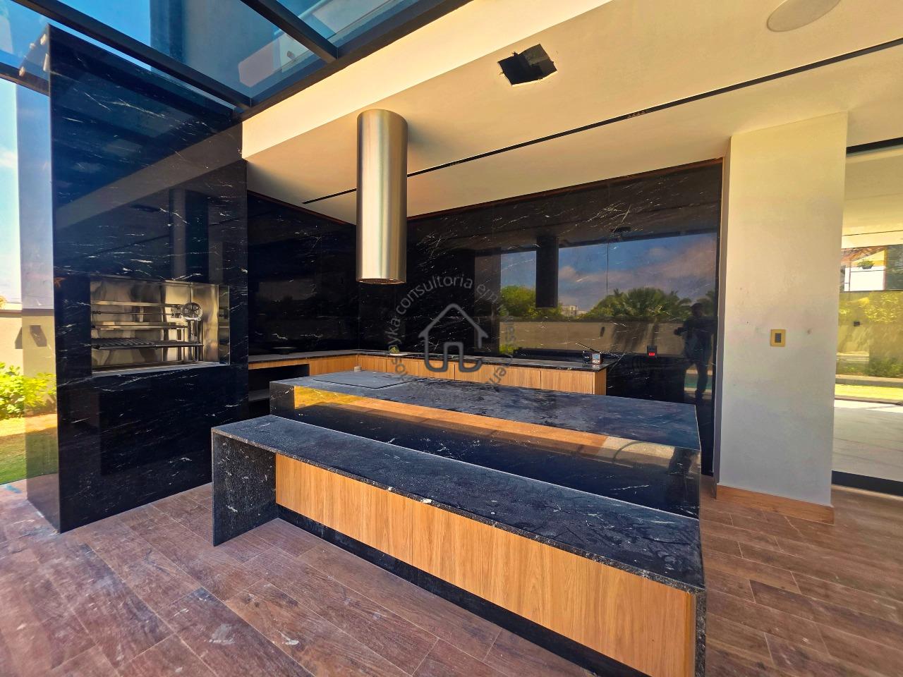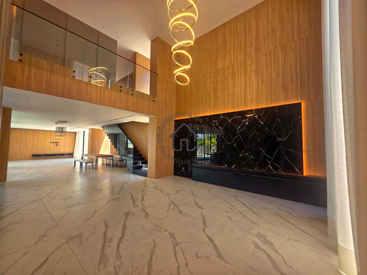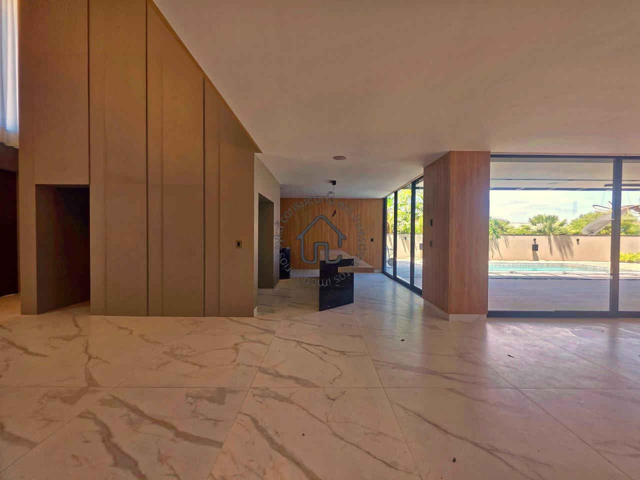 Ampla sala para dois ambientes com pé-direito elevado, sala de cinema privativa, lavabo, cozinha com layout moderno e mobiliário planejado, despensa e área de serviço.