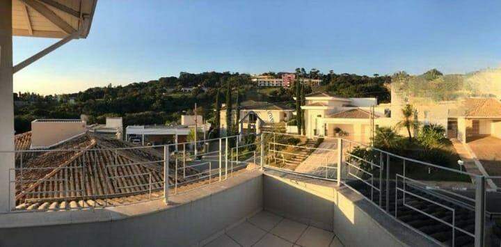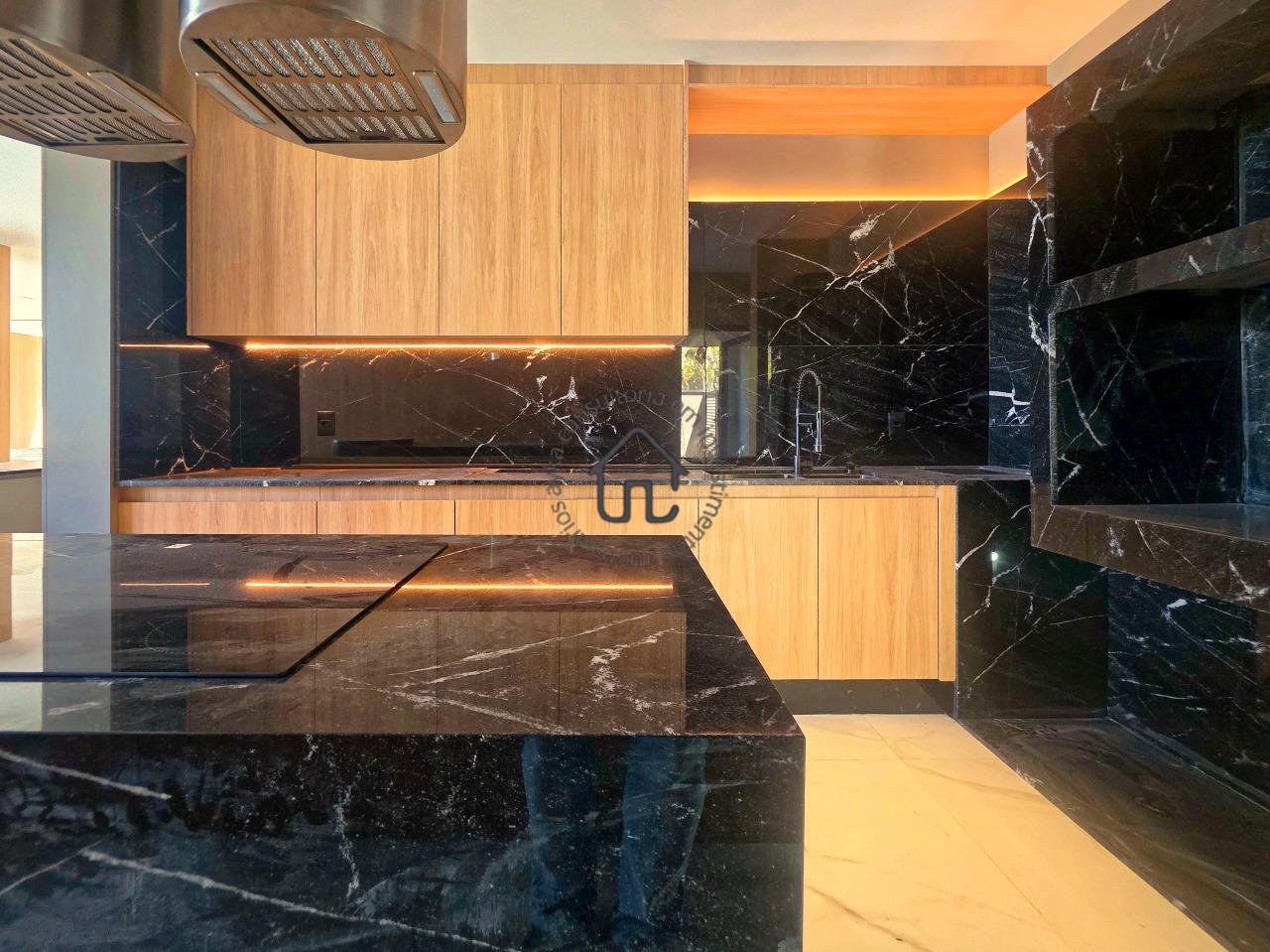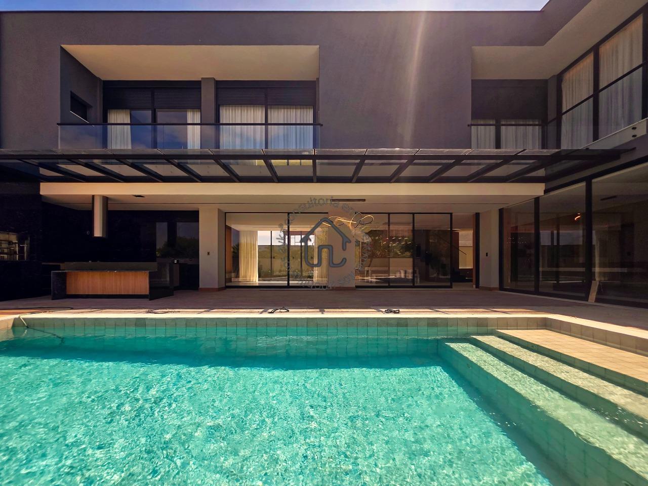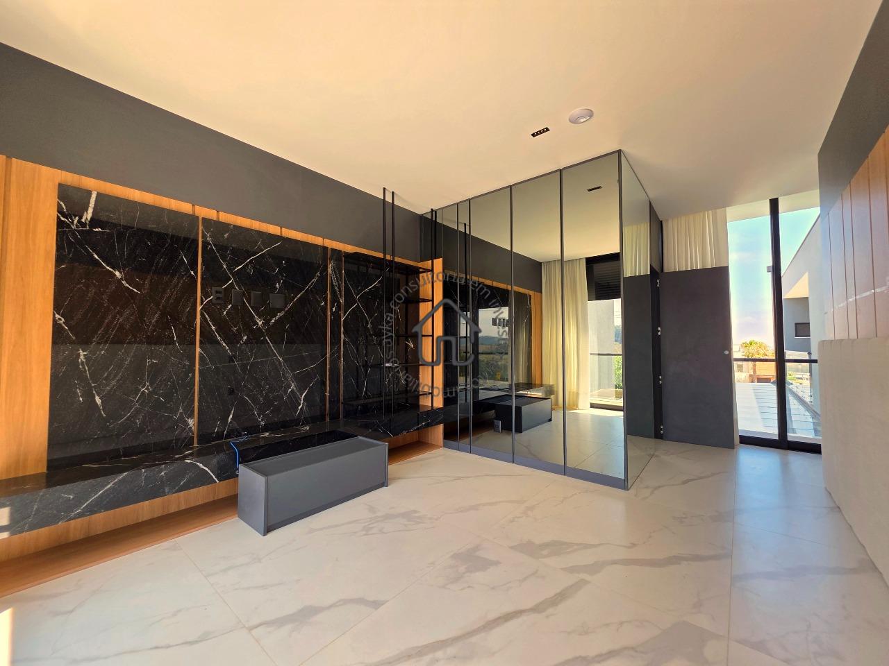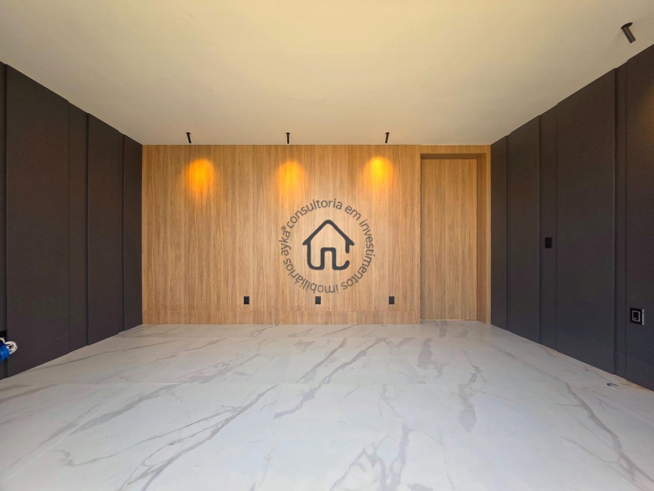 Ampla sala para dois ambientes com pé-direito elevado, sala de cinema privativa, lavabo, cozinha com layout moderno e mobiliário planejado, despensa e área de serviço.