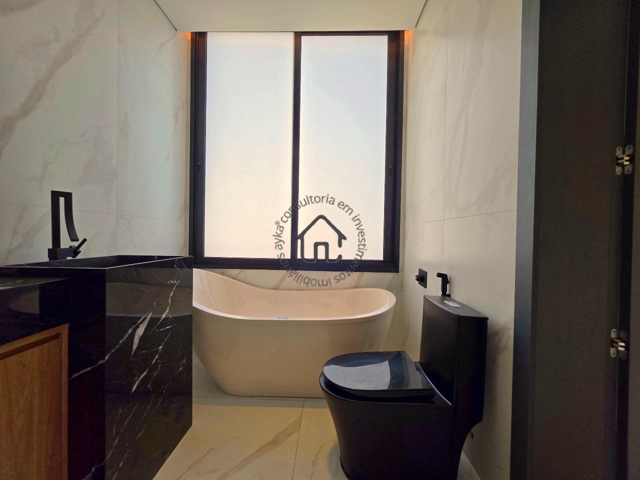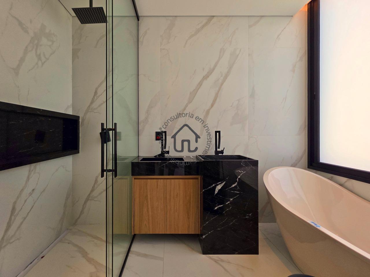 Master com closet, banheira de imersão e vista permanente para área verde.
