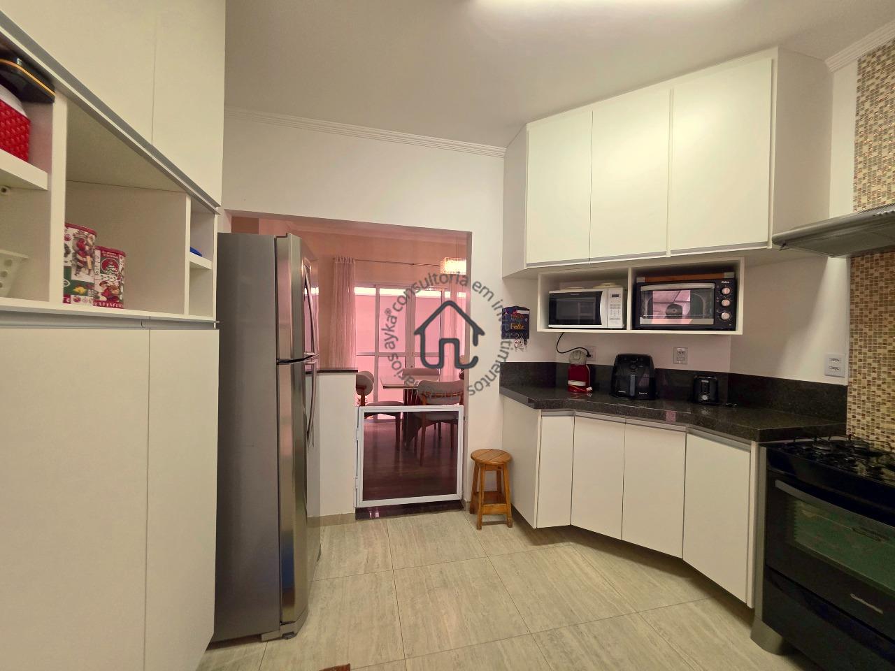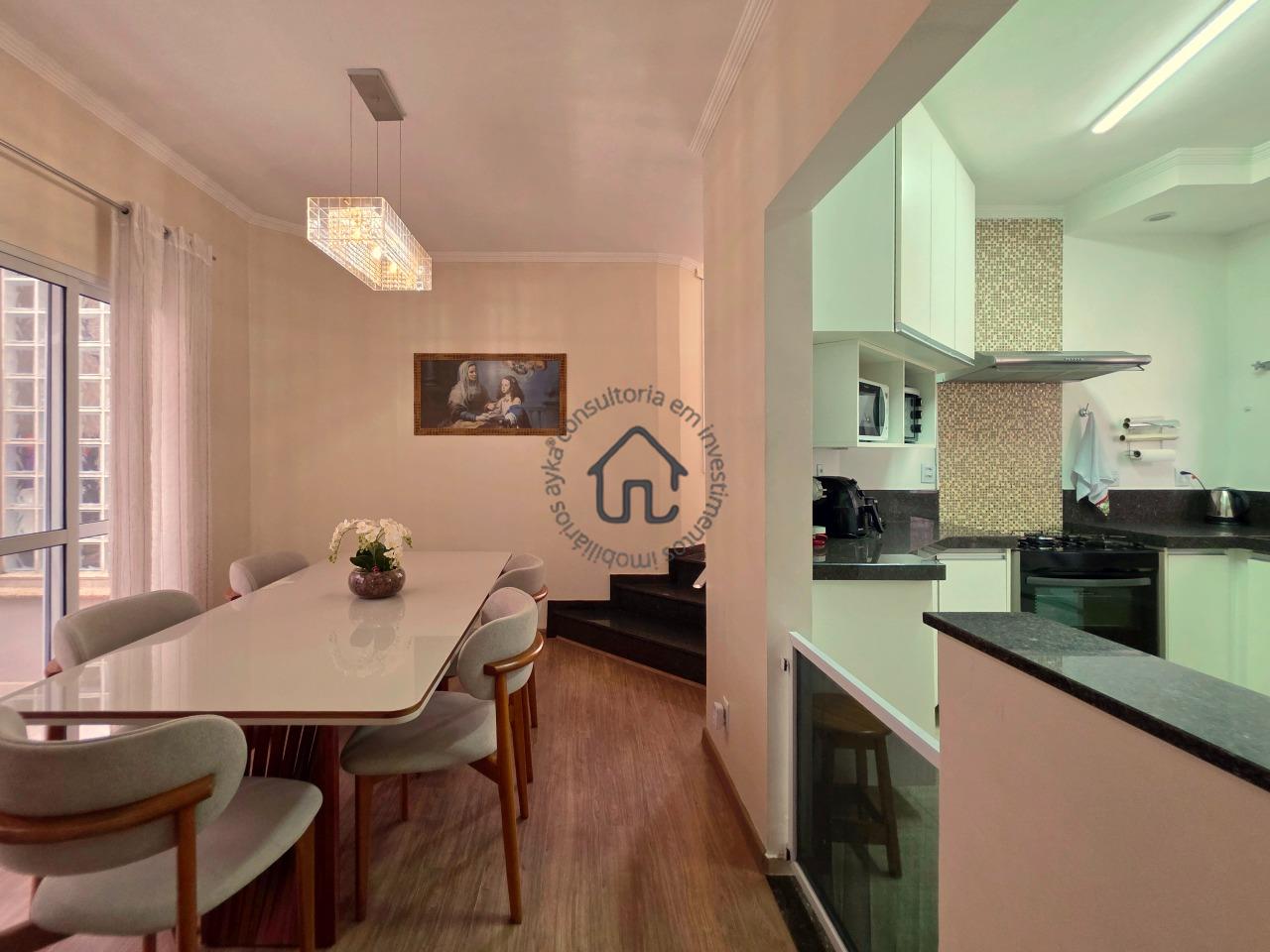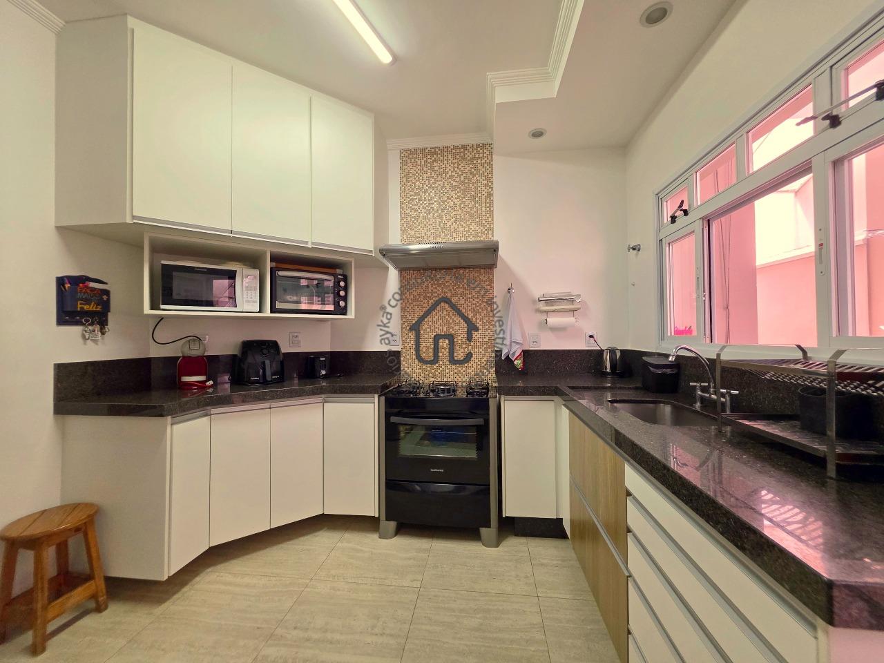 Sala de TV, sala de jantar conjugada com cozinha, que é igualmente equipada com armários planejados e área serviço.