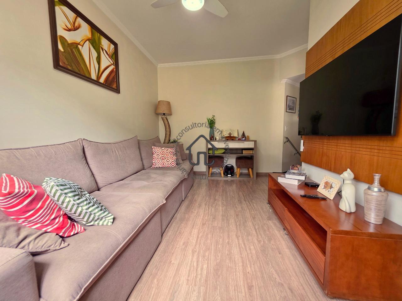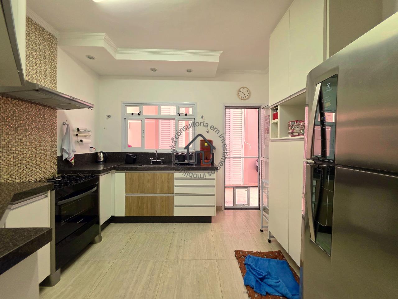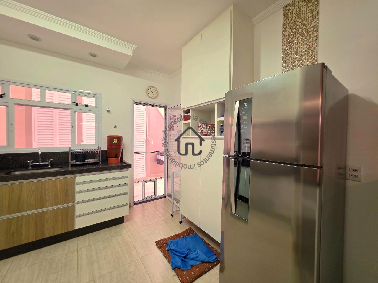Sala de TV, sala de jantar conjugada com cozinha, que é igualmente equipada com armários planejados e área serviço.