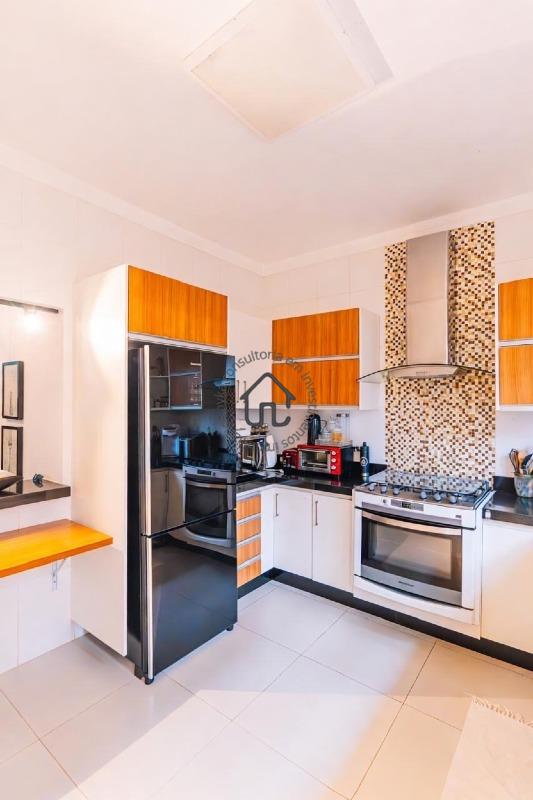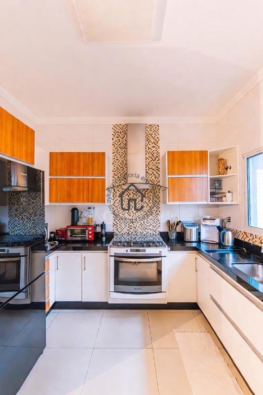Sala para dois ambientes equipada com ar-condicionado, lavabo, cozinha com armários planejados, fogão de embutir e coifa e área de serviço.