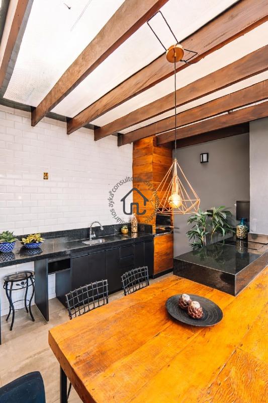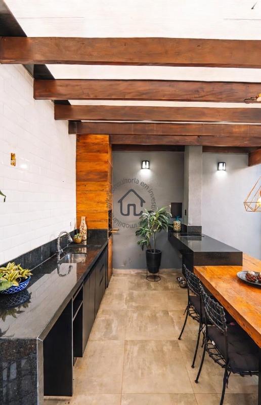 Área gourmet completa com armários e churrasqueira, integrada com piscina.